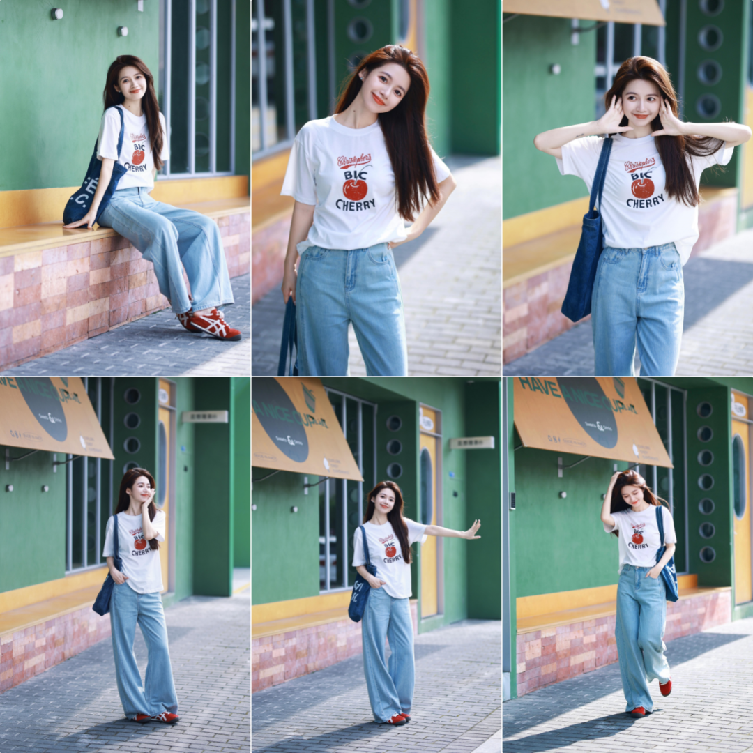 牛仔裤搭白T拍照时,可以选择坐下或站立,双手轻轻托住脸颊,眼神看向一边,再带一个微笑。这个动作简单,却能让脸型显得小巧,气质也更俏皮。托脸的姿势和牛仔白T的组合很自然,不做作,随性又大方,照片氛围感会很好。