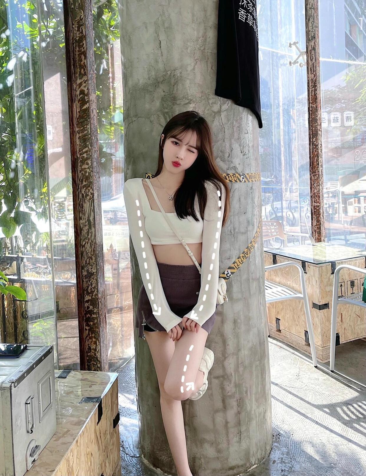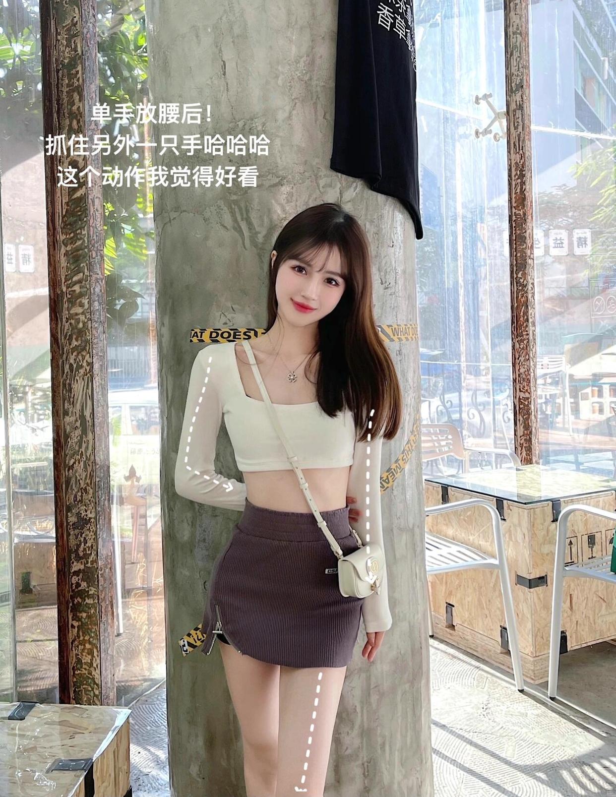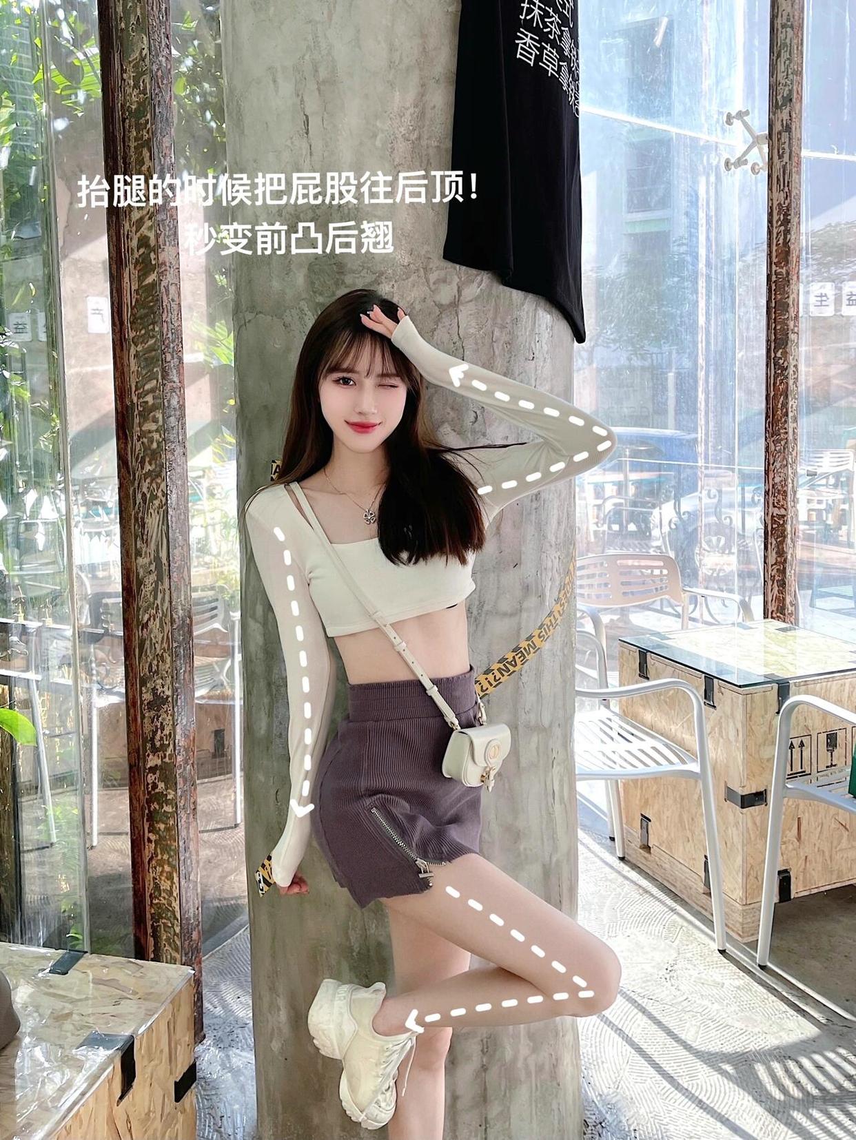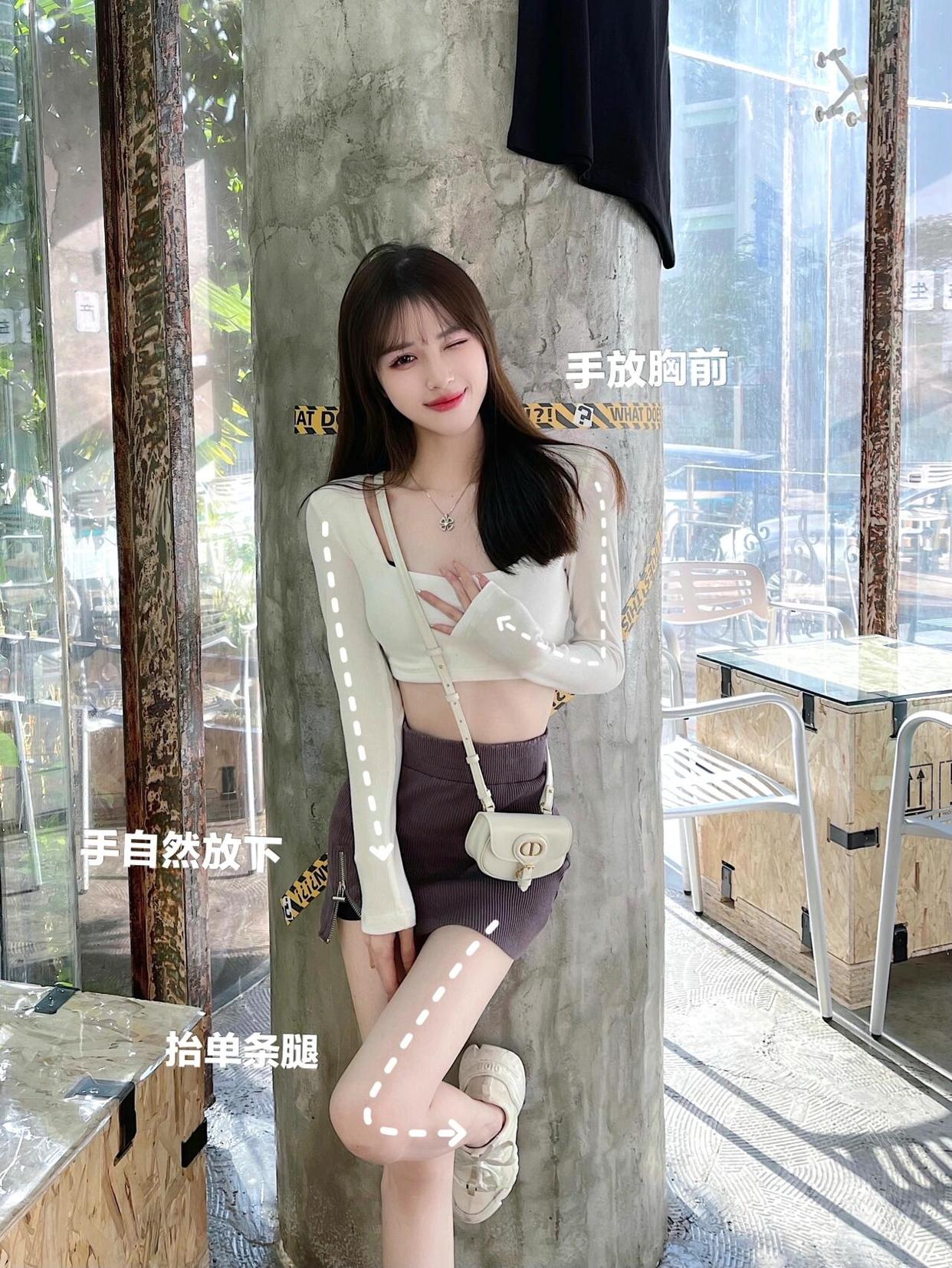这个姿势不仅简约,而且特别显腿长。站立时,一条腿稍微抬起,保持身体平衡,抬起的腿自然放松。同时,一只手自然垂下,另一只手轻放在胸前,这样的姿势显得整个人优雅又不失俏皮,拍出的照片自然大方。