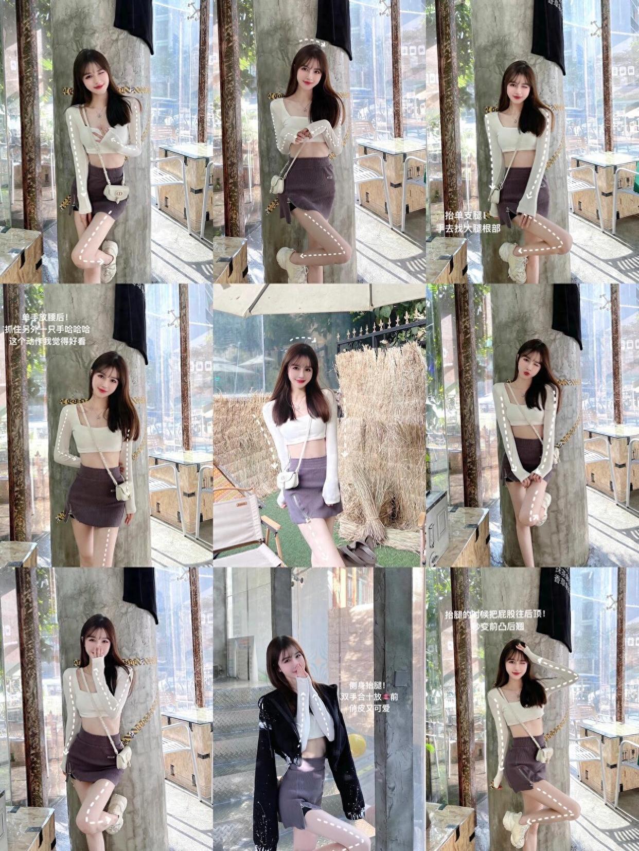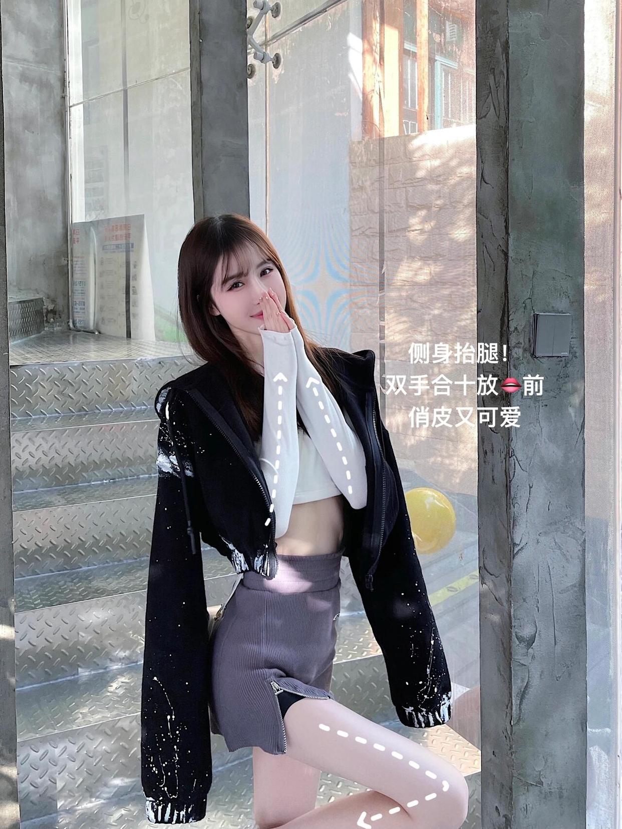 这个姿势非常适合想要拍出可爱风格的照片。站立时,一条腿微微抬起,双手交叠轻放在胸前,同时头部稍微歪向一侧,面带微笑。这样的站姿可以让照片显得甜美可爱,瞬间抓住眼球。