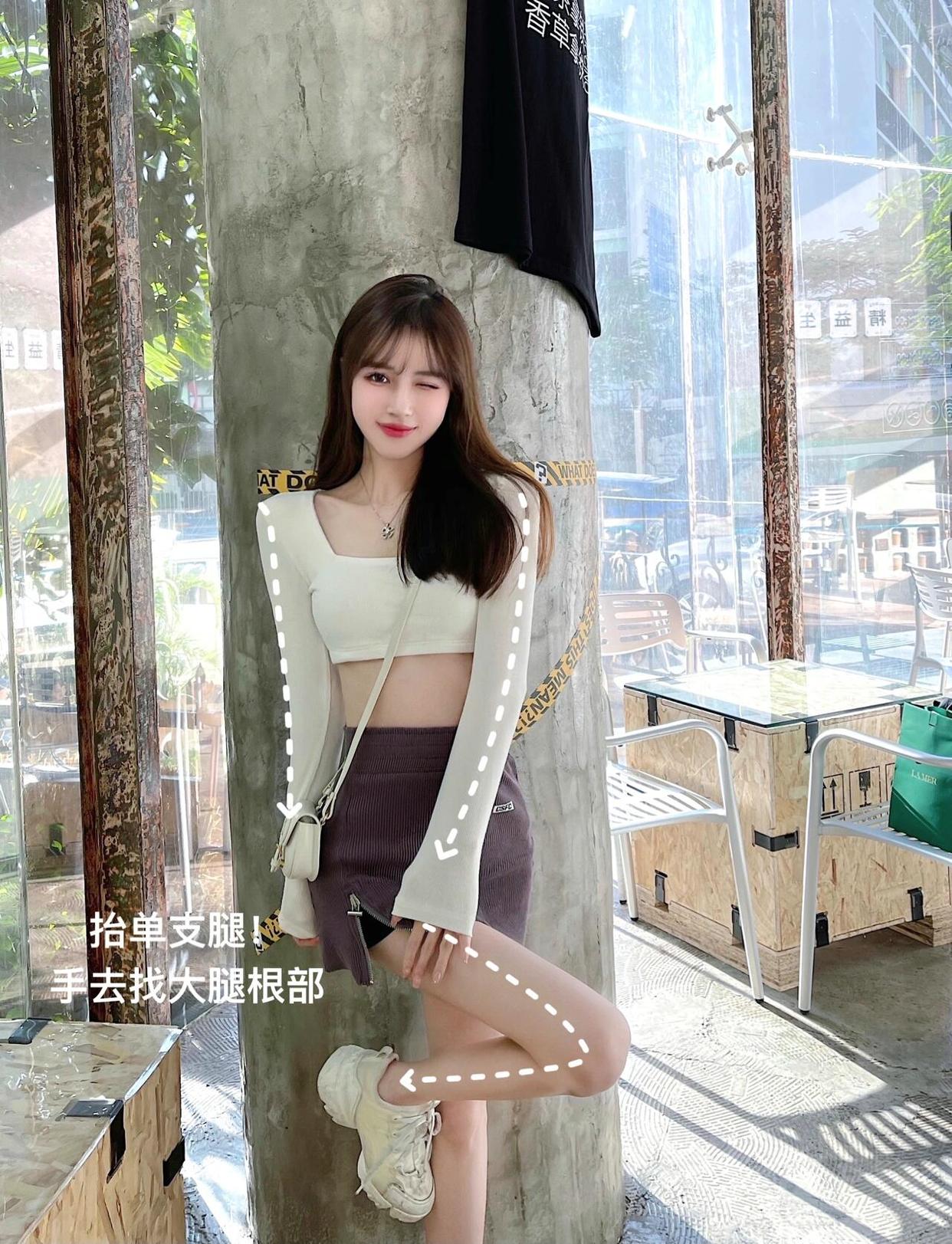这个站姿可以让你的照片更具层次感。站立时,一条腿轻轻抬起,一只手自然垂放,另一只手轻放在大腿根部,这样的姿势可以突出腿部线条,同时也增加了照片的趣味性,显得简单好看。
