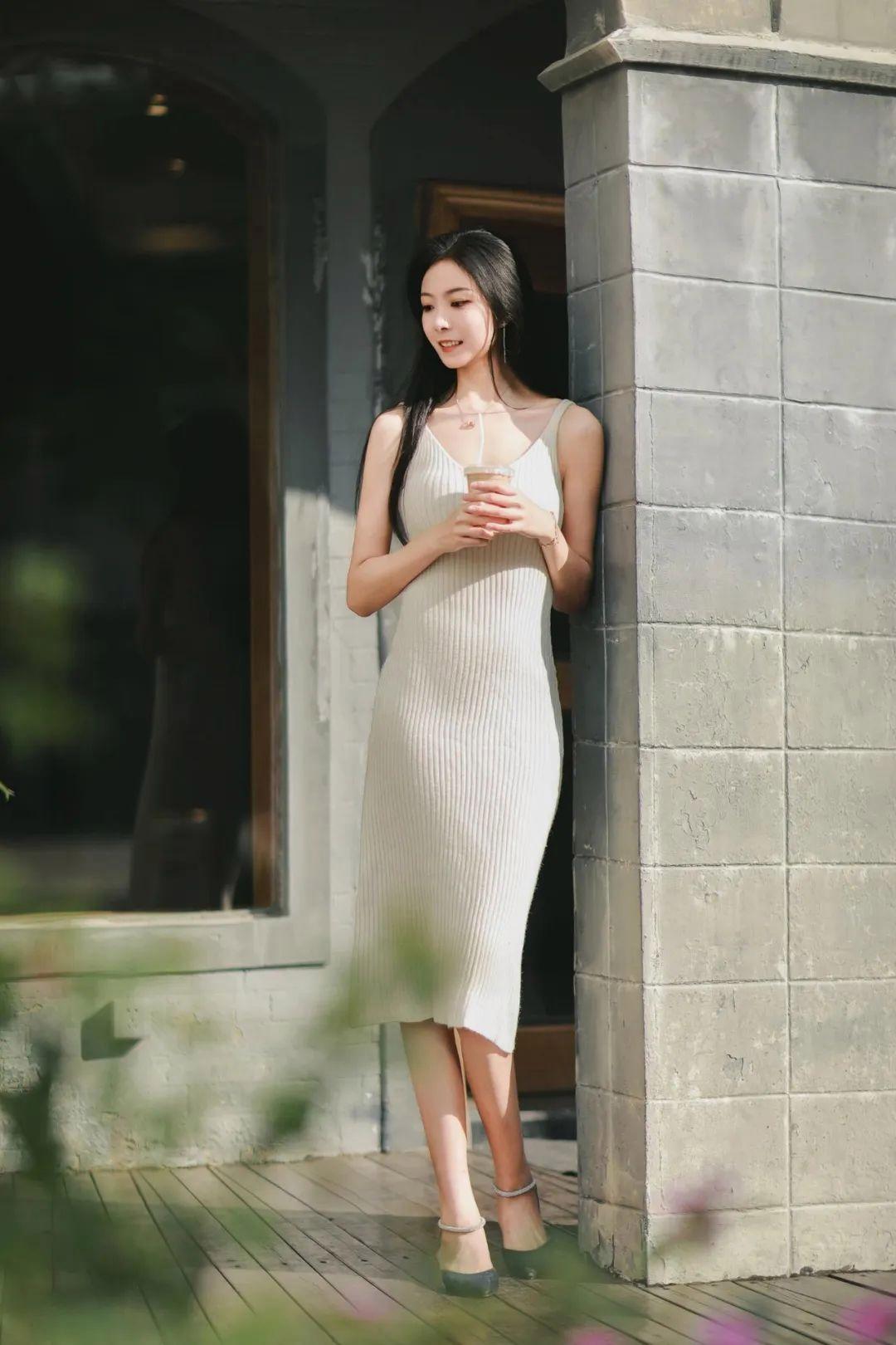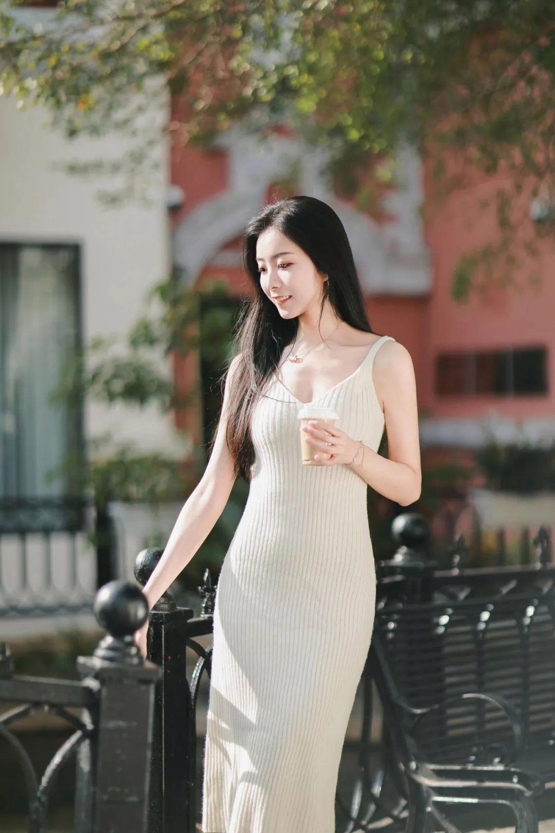 侧身站立,双手拿着咖啡,脸上带着浅浅的微笑。这一姿势能够很好地突出你的侧颜之美,同时将裙子的温柔气质展现得淋漓尽致。微笑的神态让照片更加生动,充满时尚感。