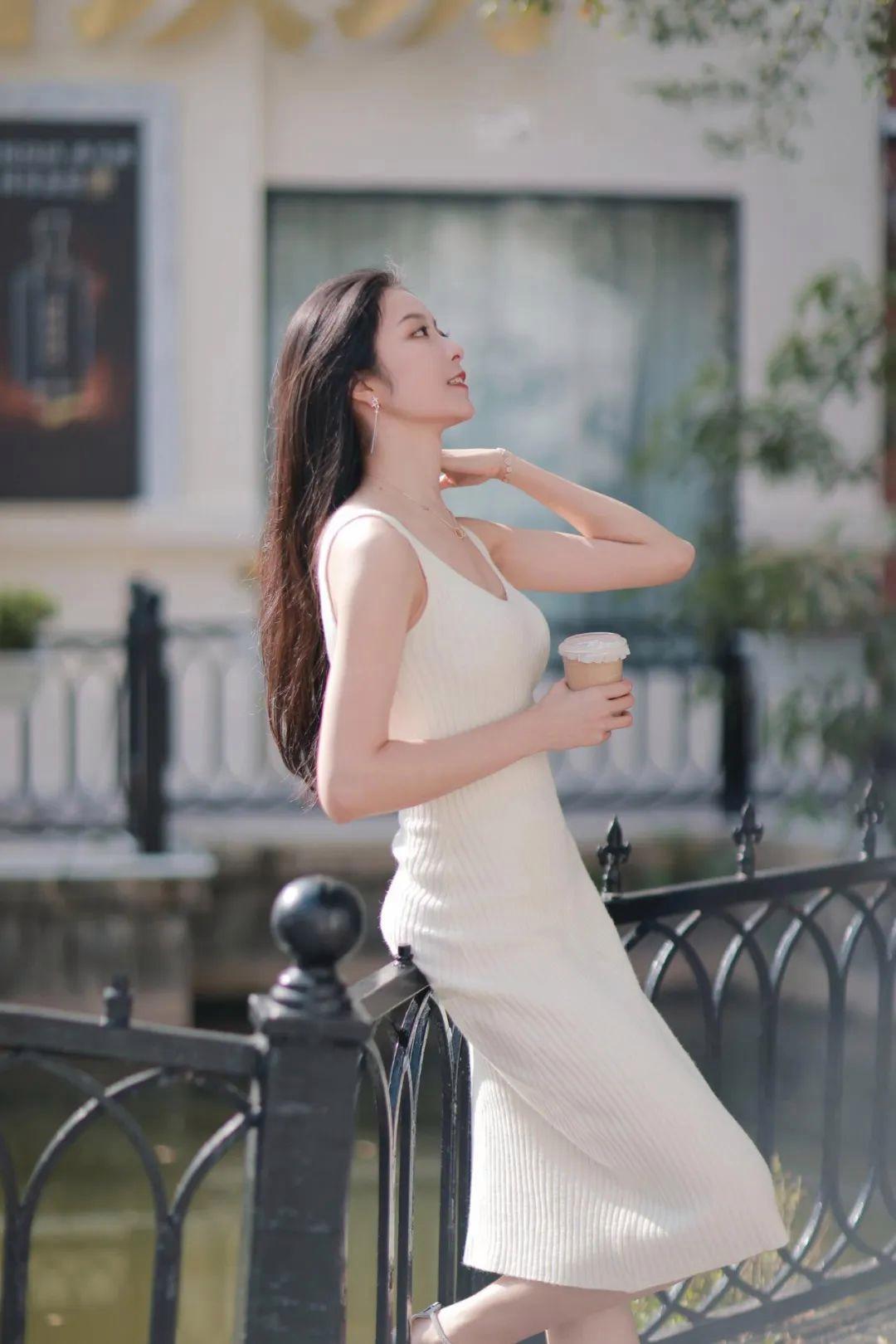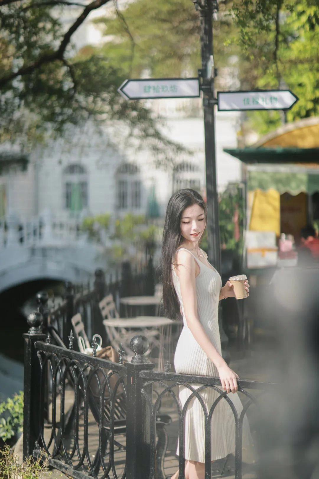 穿着裙子站在街边的栏杆旁,一手轻松搭在栏杆上,另一手拿着咖啡,侧颜微笑。这种姿势适合展现你温柔的侧颜,同时通过栏杆的延伸感,让照片看起来更加有层次,营造出时尚漂亮的效果。