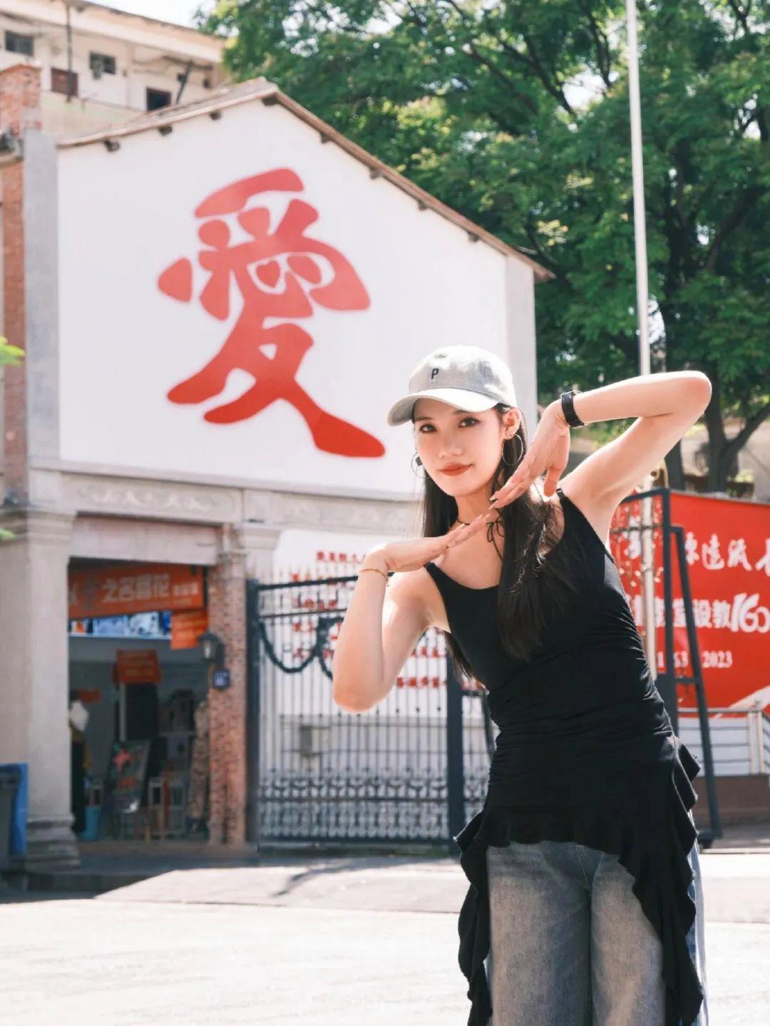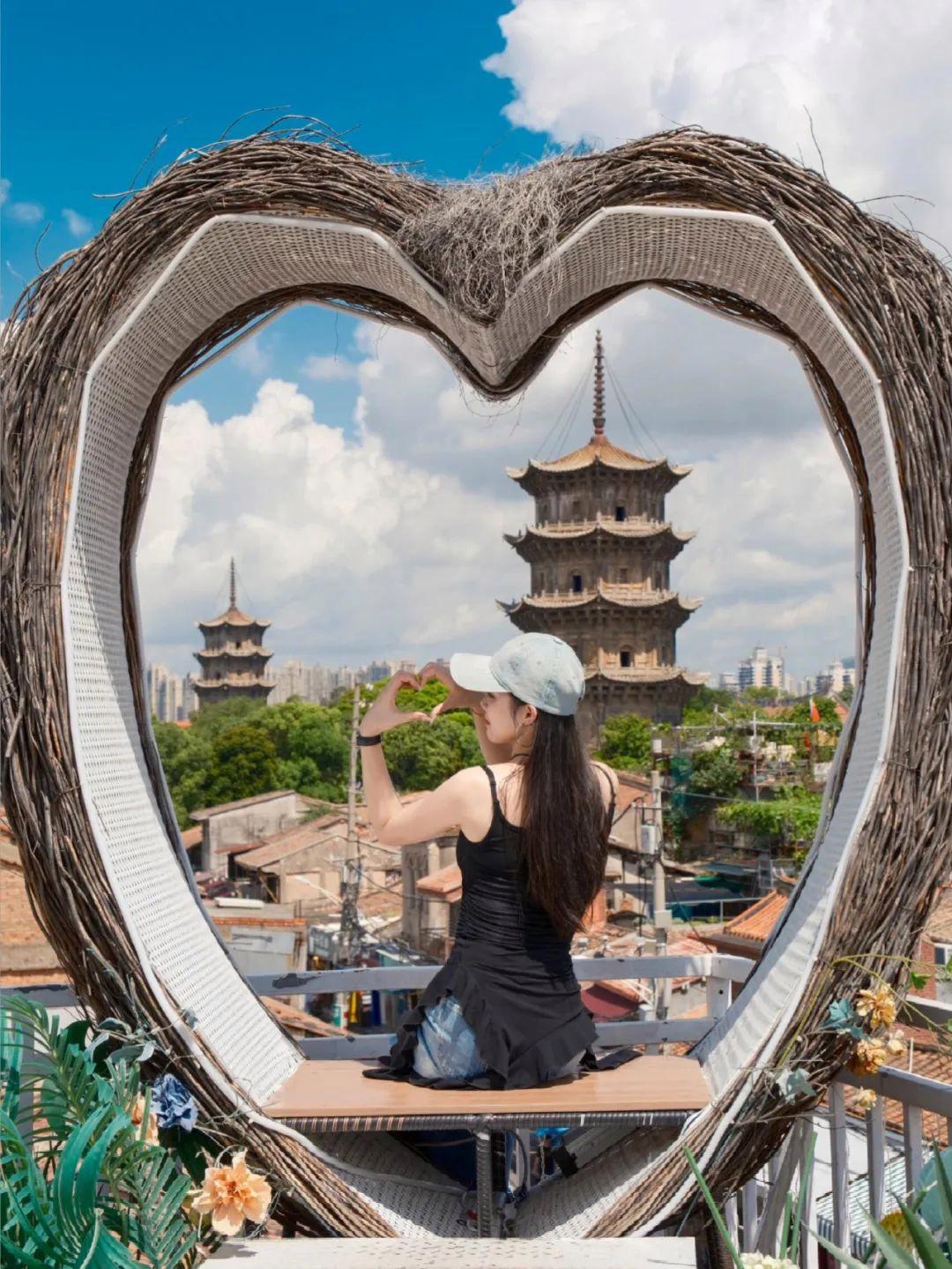 和景点合拍时,比心的动作是个经典又可爱的选择。无论是双手合并比心还是单手比心,都是展现你对旅游景点喜爱之情的好方法。再配上美丽的背影,整个照片充满了甜美和爱意,让你的旅游打卡拍照更具特色。