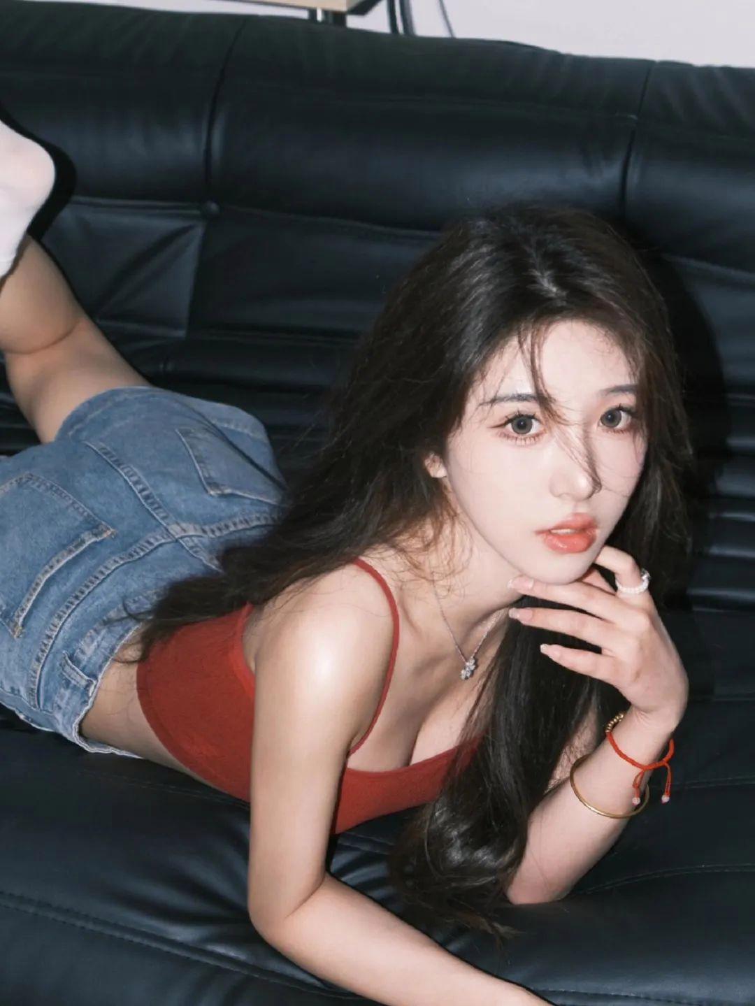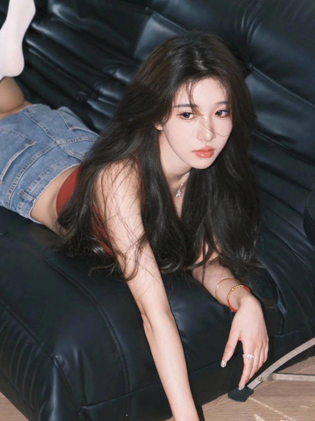 趴在沙发上,双脚轻轻翘起,眼神直接对镜头,这种姿势充满了俏皮与可爱的感觉。