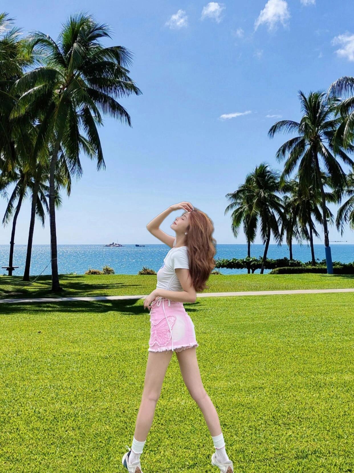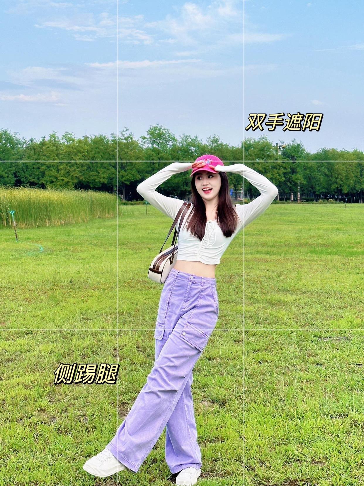 这个姿势将身体的重心放在一条腿上,另一条腿轻轻侧踢,同时双手举起遮阳。这样不仅能够拉长腿部线条,还可以通过手臂的伸展让上半身更加纤细。自然地展现出悠闲自信的氛围,显高显瘦的效果一目了然。