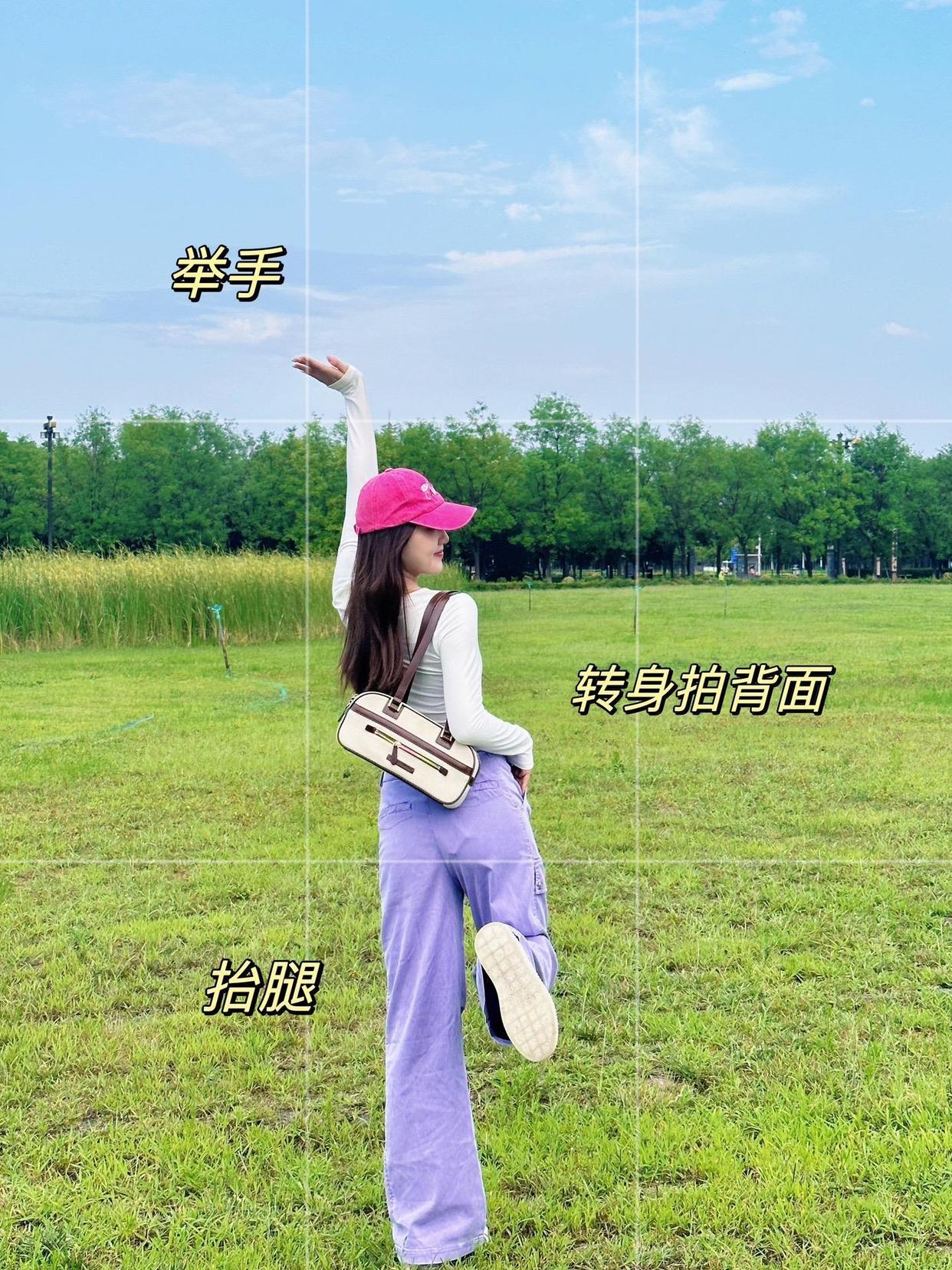 侧身站立,一只腿轻轻踢起,手挎包包,回头看镜头,这样的姿势既能展现出优雅的身形,又能拉长腿部线条。回头的动作不仅增加了照片的层次感,还能够让你显得更加纤细高挑。