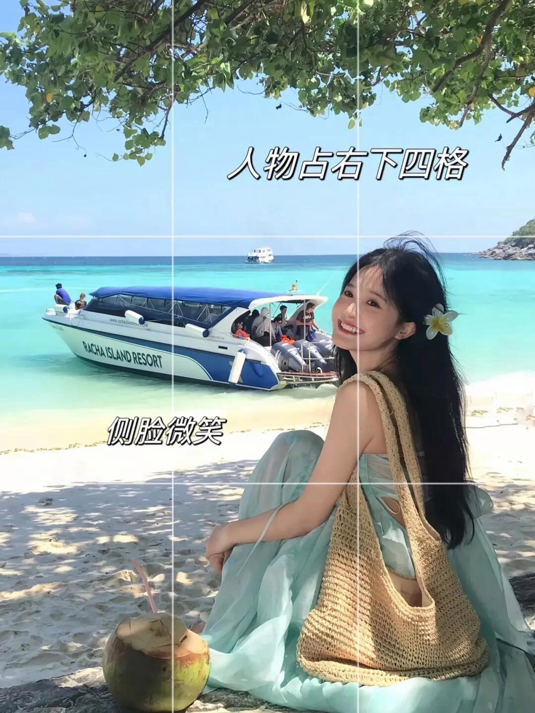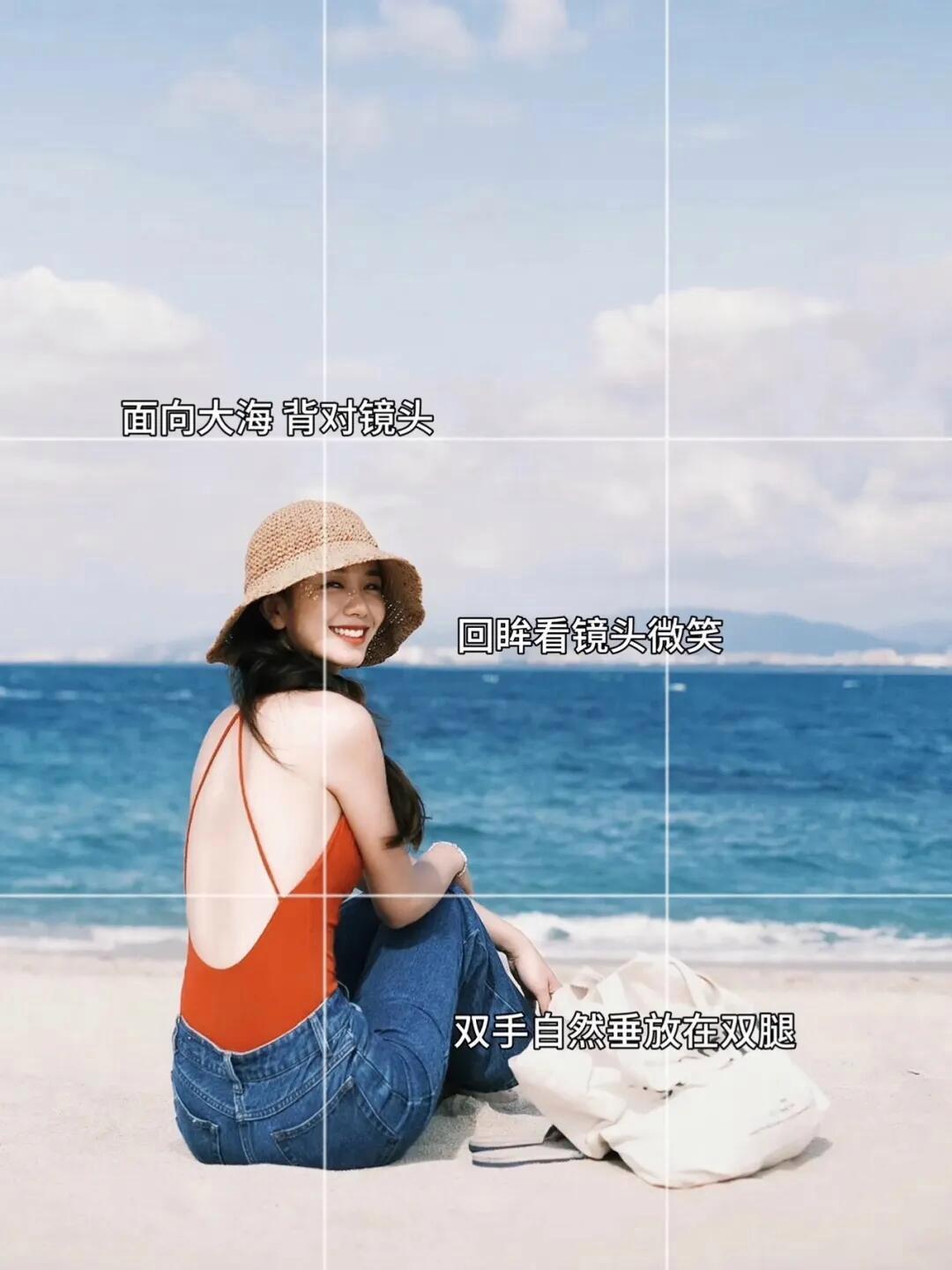 在海边拍照时,将人物放在左下方,坐着双手放膝盖,面朝大海回头微笑,不仅能展现大海的广阔美丽,还能通过简单的姿势表现出旅行中的轻松与惬意,是值得收藏的朋友圈美照。