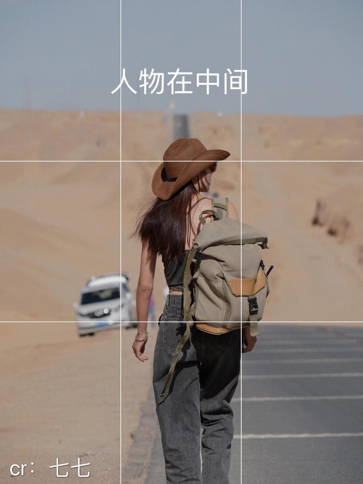 将人物放在画面中心,稍微回头微微一笑,能捕捉到自然的美。这个简单的姿势不仅能展现旅途中的愉悦心情,还能让照片显得温暖、亲和,非常适合拍摄朋友圈爆款美照。
