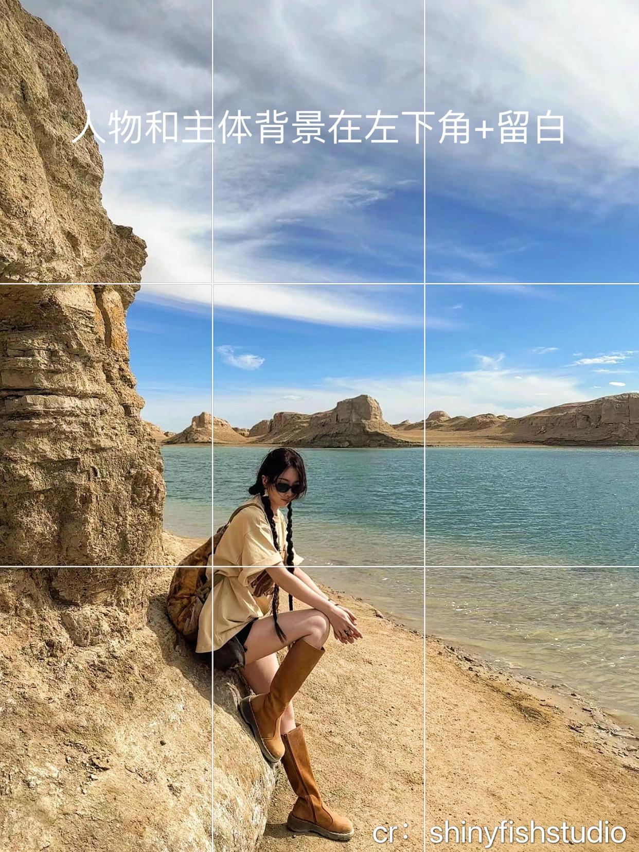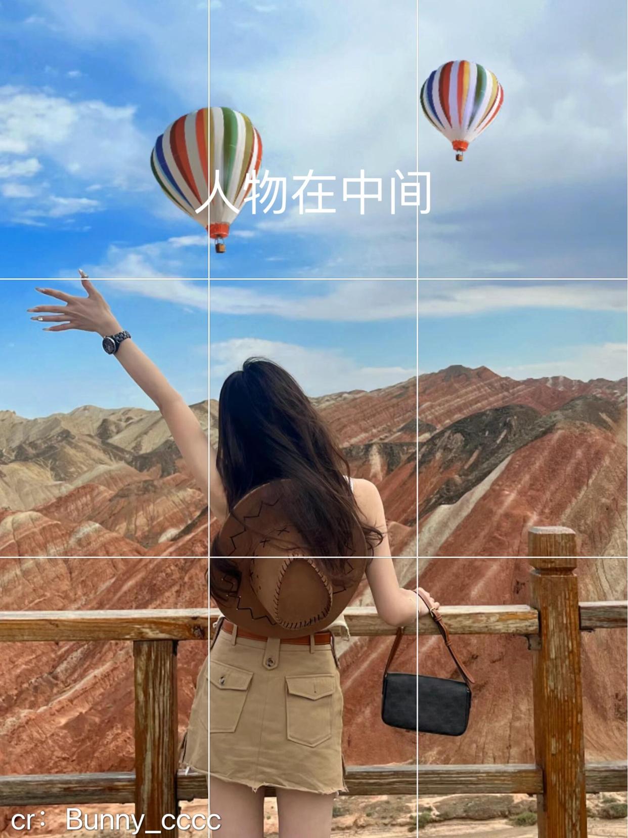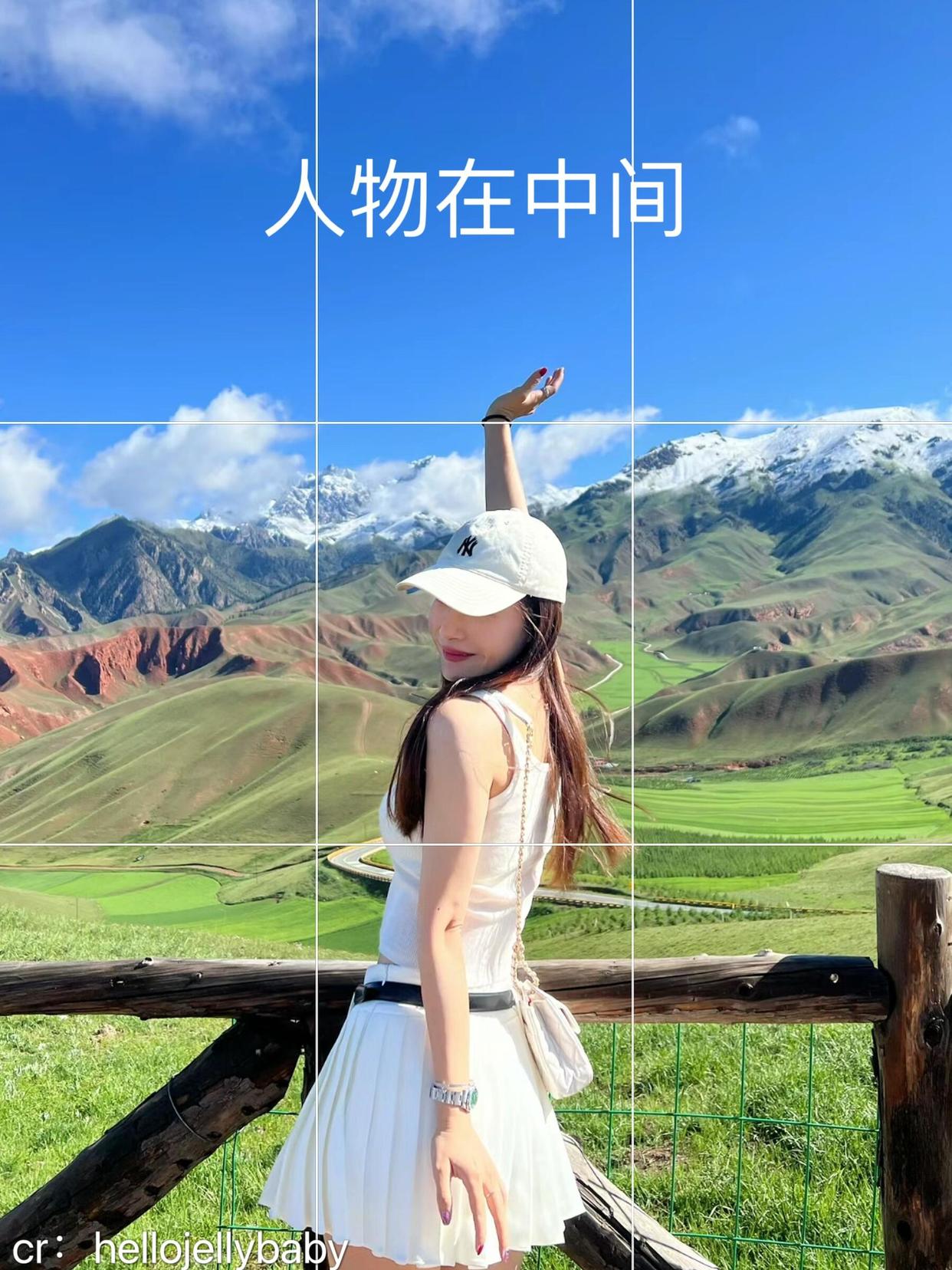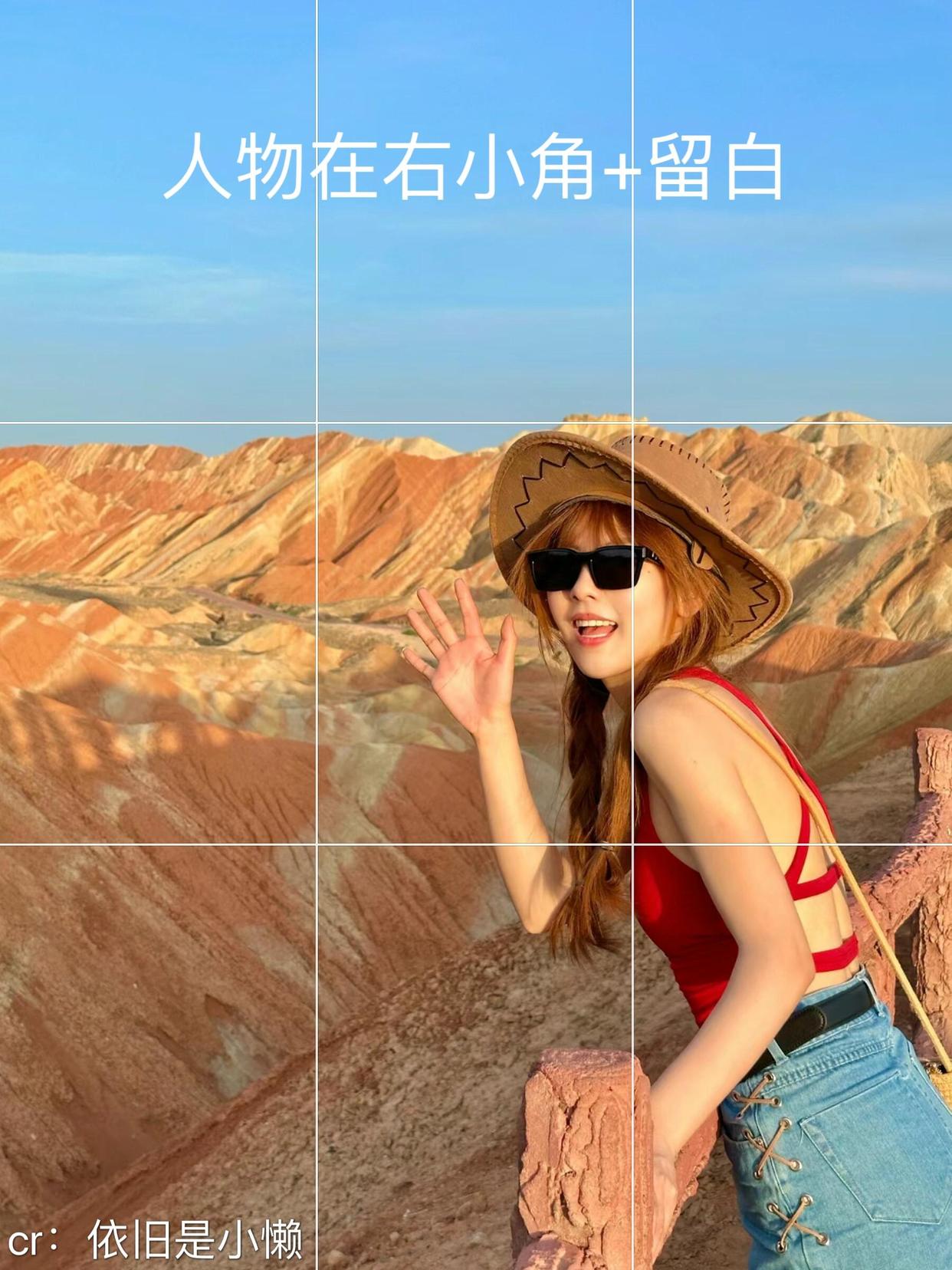 如果想让照片更具艺术感,可以试试上方留白,将人物放在右下角,侧身回头打招呼。这个构图能利用留白增加照片的层次感,同时,侧身回头的拍照姿势能让照片看起来轻松愉悦,适合拍摄宽广的景色。