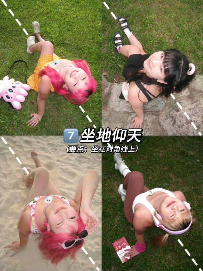 坐在地上,身体仰天,脚伸出去形成对角线,这样的姿势能够有效拉长身体的比例,使得整个人看起来又高又瘦。这个姿势非常适合户外拍照,尤其是在宽敞的场景中,能够展现出你修长的身材。