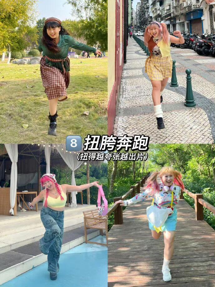 拍照时,夸张的动作往往能够带来意想不到的效果。扭胯奔跑的动作能够让整个身体线条更加流畅,手臂的摆动则能让照片看起来更加动感十足。这个姿势简单又好学,能够轻松拍出显瘦好看的照片。