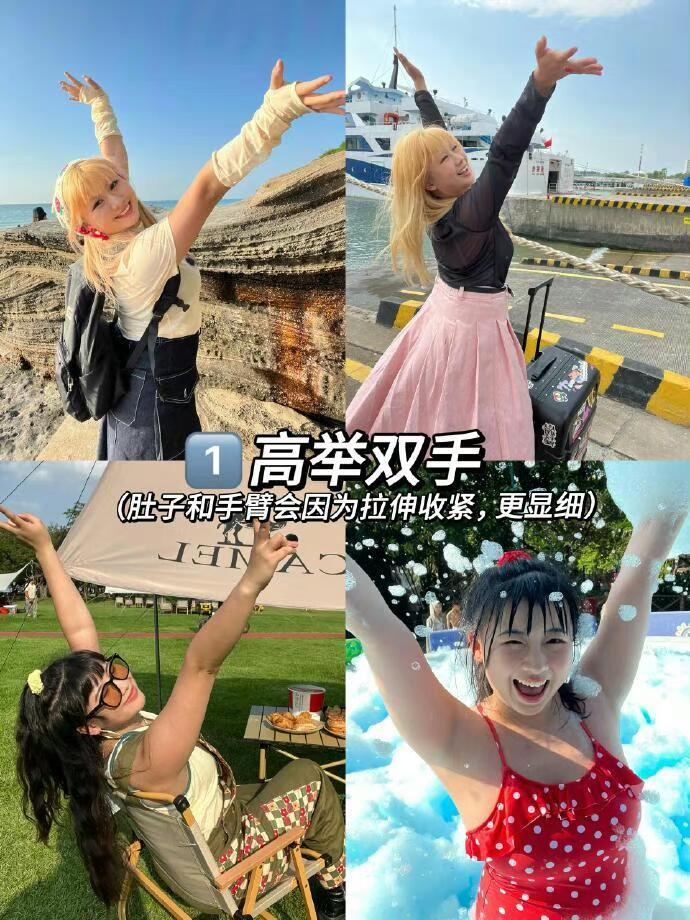 拍照时高举双手不仅能够让肚子和手臂收紧,还能显得整个人更加纤细。这个动作能够有效地拉长身体线条,使得上半身显得更加修长,对于想要遮肉的女生来说,是一个非常实用的技巧。
