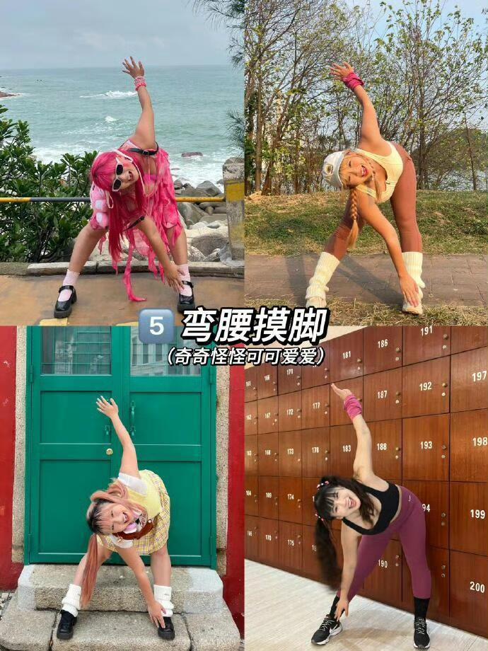 奇奇怪怪的姿势有时反而能够带来意想不到的效果。一手弯腰摸脚,另一手高高举起,这个姿势不仅能够自然遮住肚子,还能拉长身体的线条,显瘦的同时又增添了几分趣味。