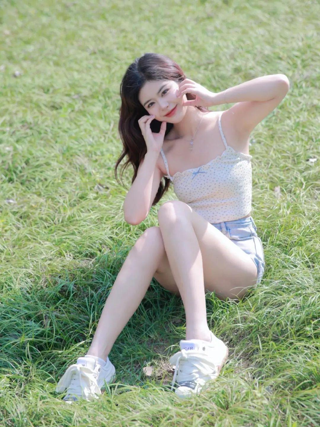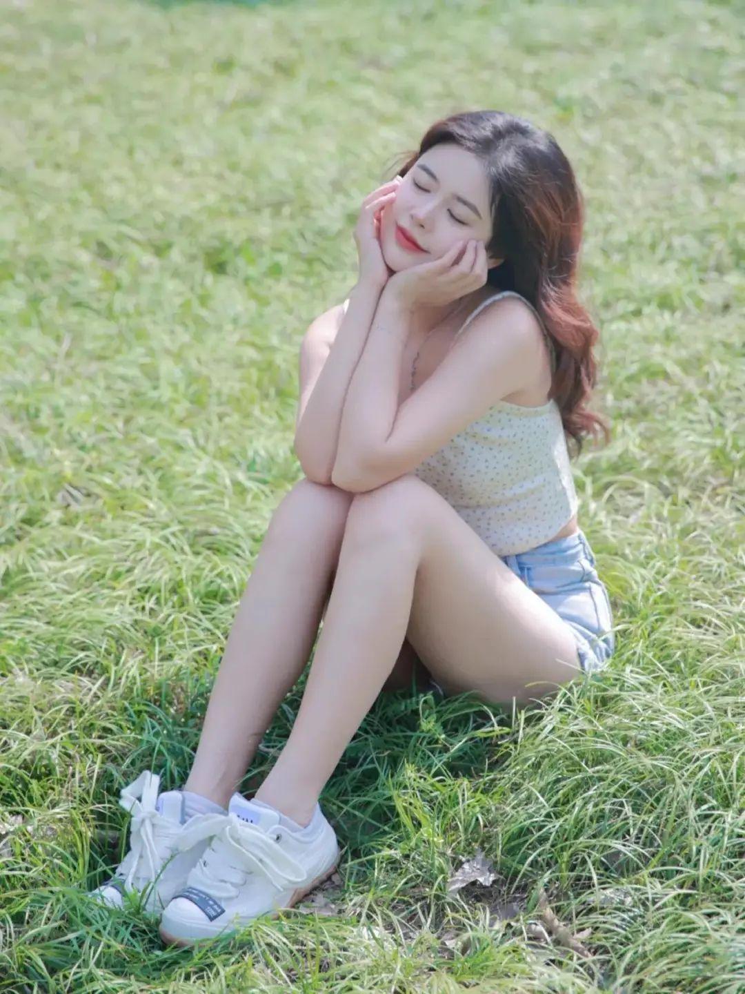 这个姿势简单易学,只需坐在草地上,轻轻弯曲一条腿,然后双手自然地伸向脚踝,假装在整理鞋子。这种姿势不仅显得自然,还能通过腿部的弯曲让整体线条更显修长,轻松展现出优雅的气质。
