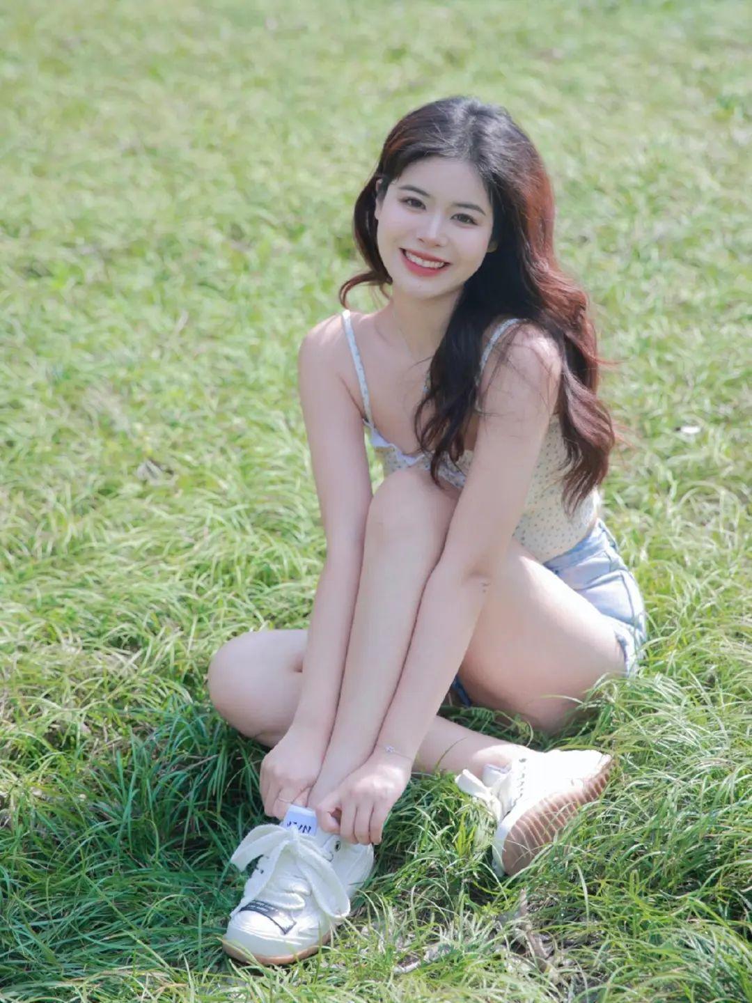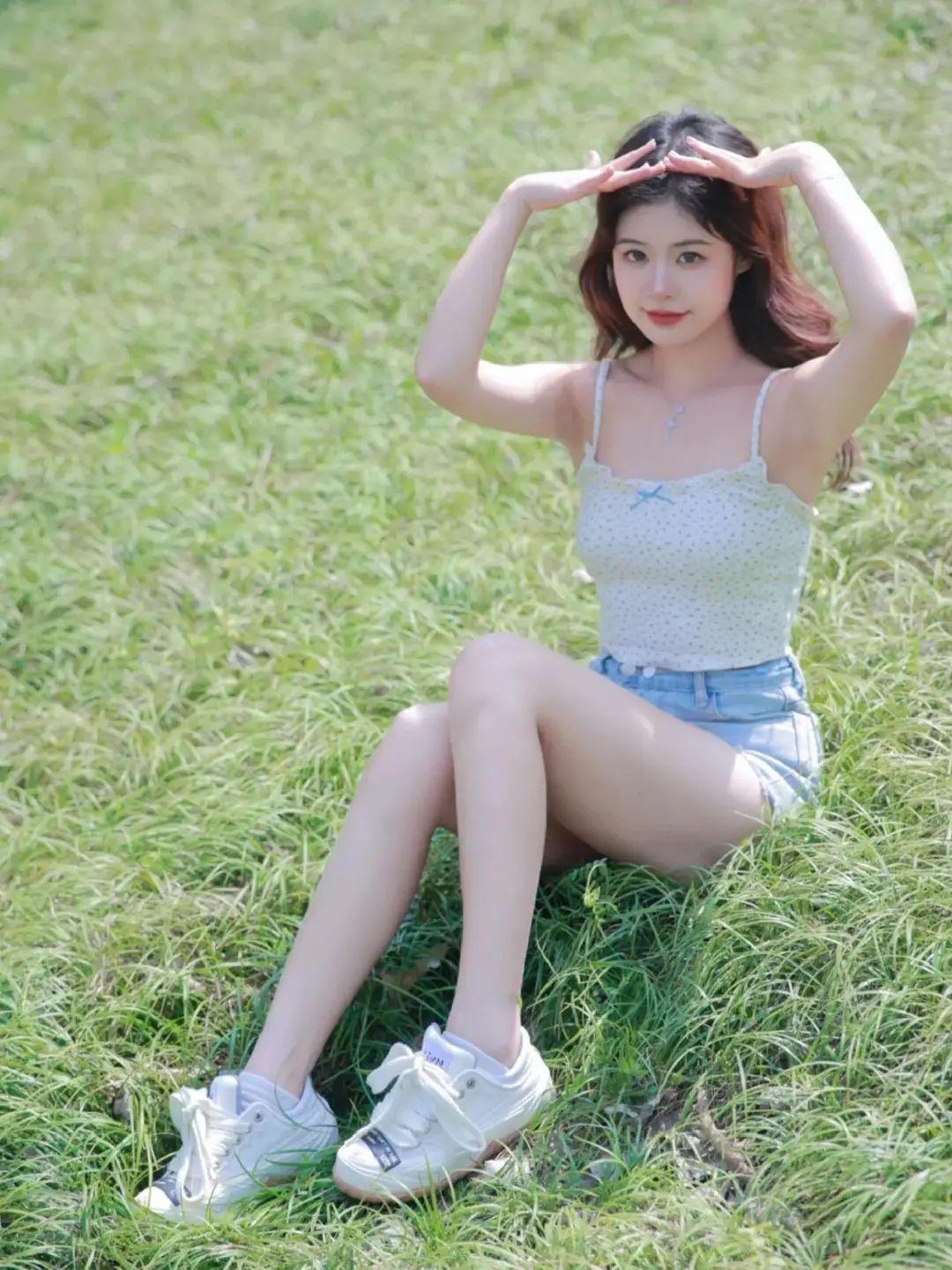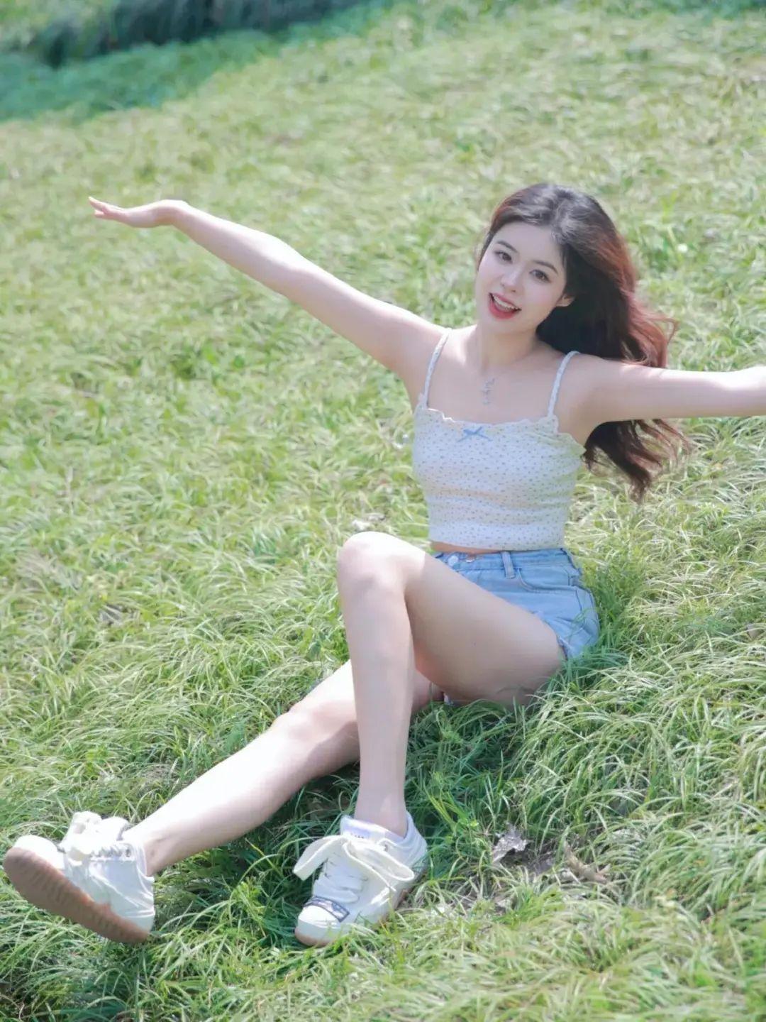 坐在草地上,侧身面对镜头,一条腿自然伸直,另一条腿微曲,双手向两侧张开,配上灿烂的笑容。这个姿势能够很好地展现腿部线条,同时双手的伸展让整个人看起来更加有活力,拍出来的照片自然又好看。