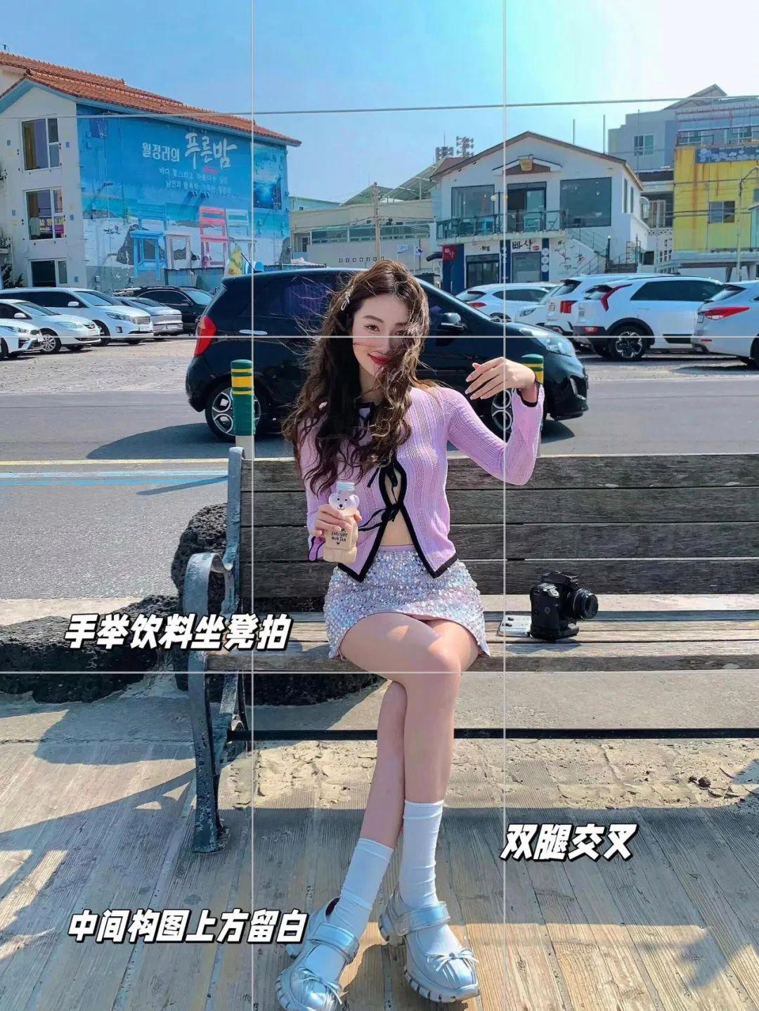 坐在街边的长凳上,双腿交叉,手举饮料,目视远方。人物处于画面中央,给上方留出空白。这种中间构图法简单大方,能让照片显得更有层次感,适合在城市景点拍摄。