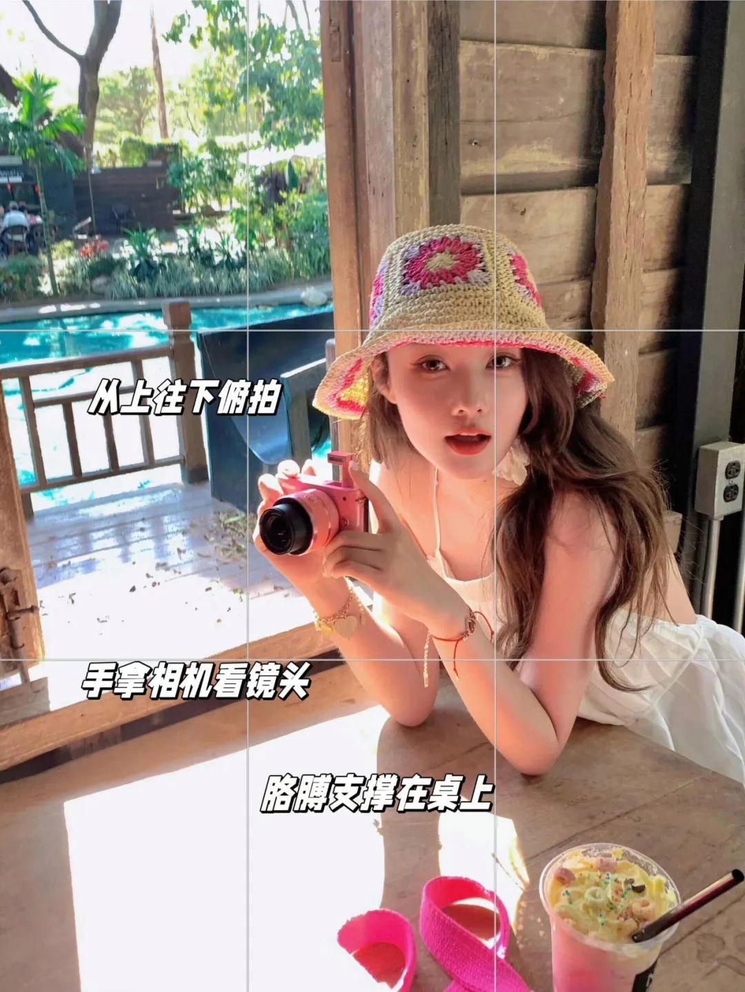 在餐厅或咖啡馆里,用手肘支撑在桌面上,手拿相机看向镜头,从上往下俯拍。这种姿势能很好地展示餐桌上的美食,同时也给照片增添了一些生活气息,适合拍出休闲自在的感觉。