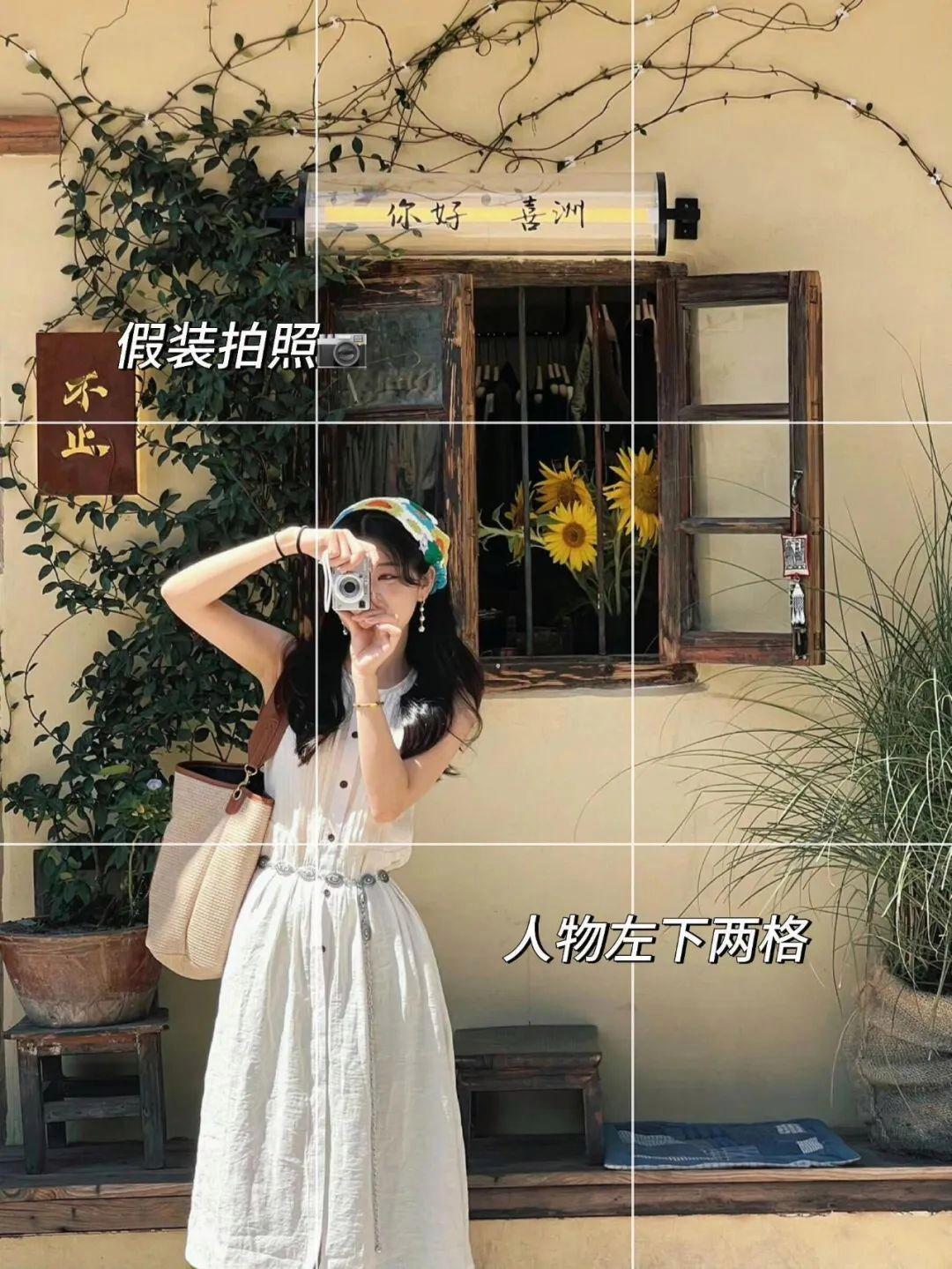 假装正在拍照,但实际上你是被拍摄的对象。人物放在左下两格,留出大片背景。这种抓拍方式能很好地捕捉自然的神情,适合在风景优美的地方拍摄。