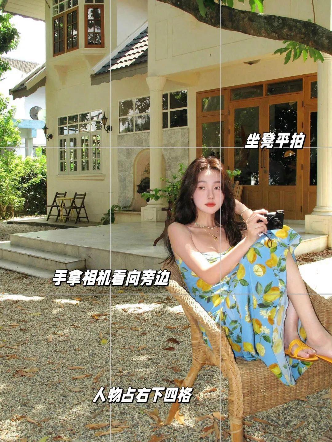 坐在凳子上,手拿相机看向一侧,将人物放在画面的右下角。这种姿势和构图方式非常适合在历史街区或古镇拍摄,能营造出一种沉静的氛围。