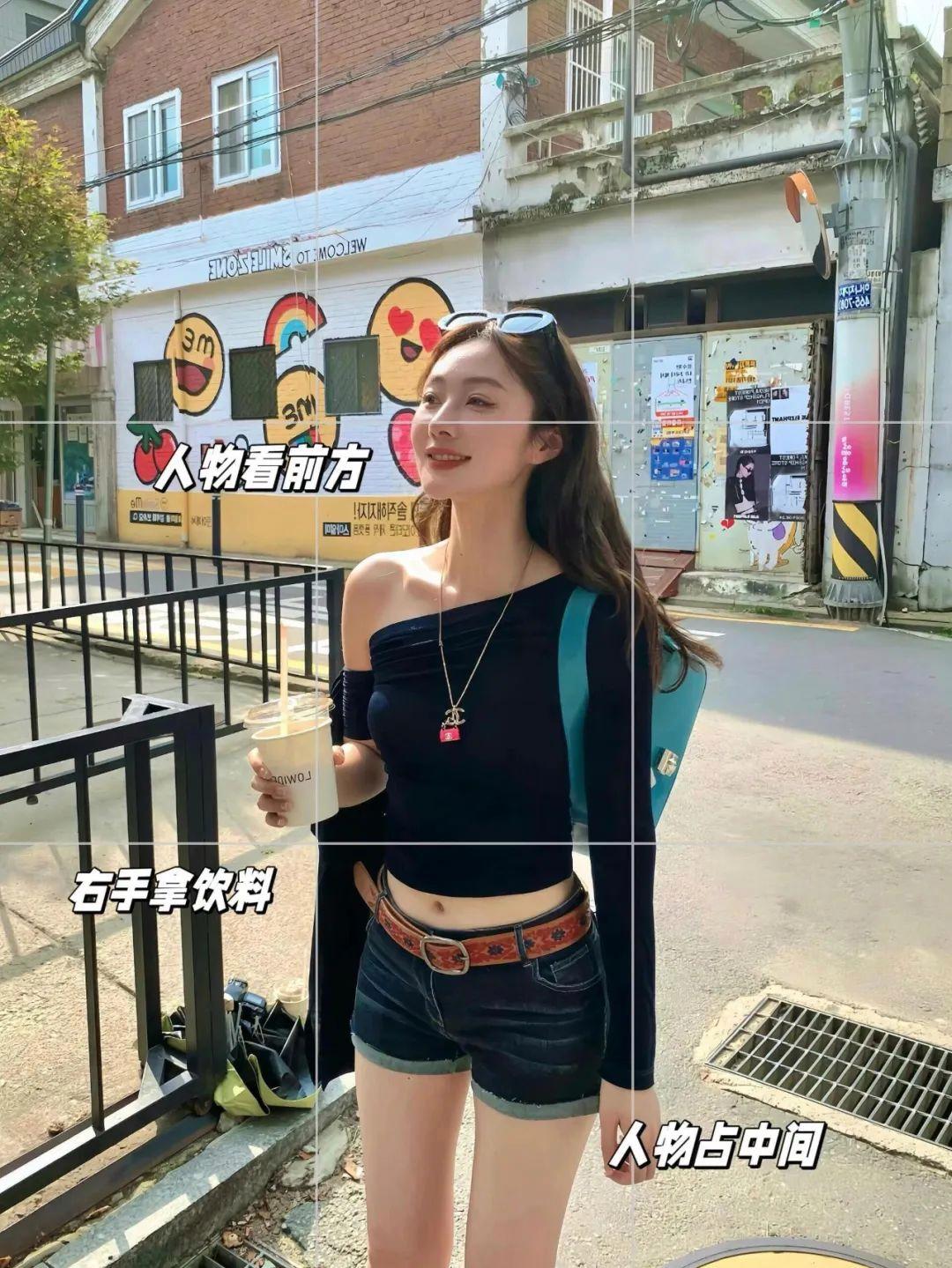 将人物放在画面中央,右手拿着饮料,微笑看向前方。这种姿势适合在自然风光或景点中拍摄,能够凸显出人物的自然美感,简洁大方,效果出众。