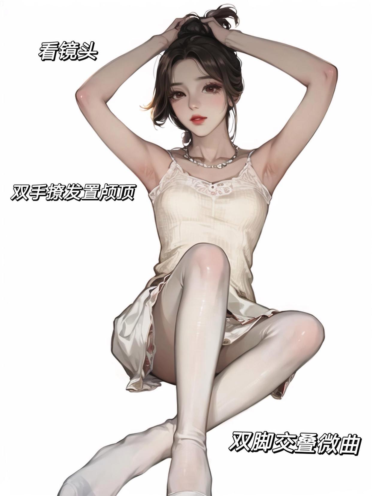 8. 双脚交叠微曲,双手撩头发发顶,看着镜头