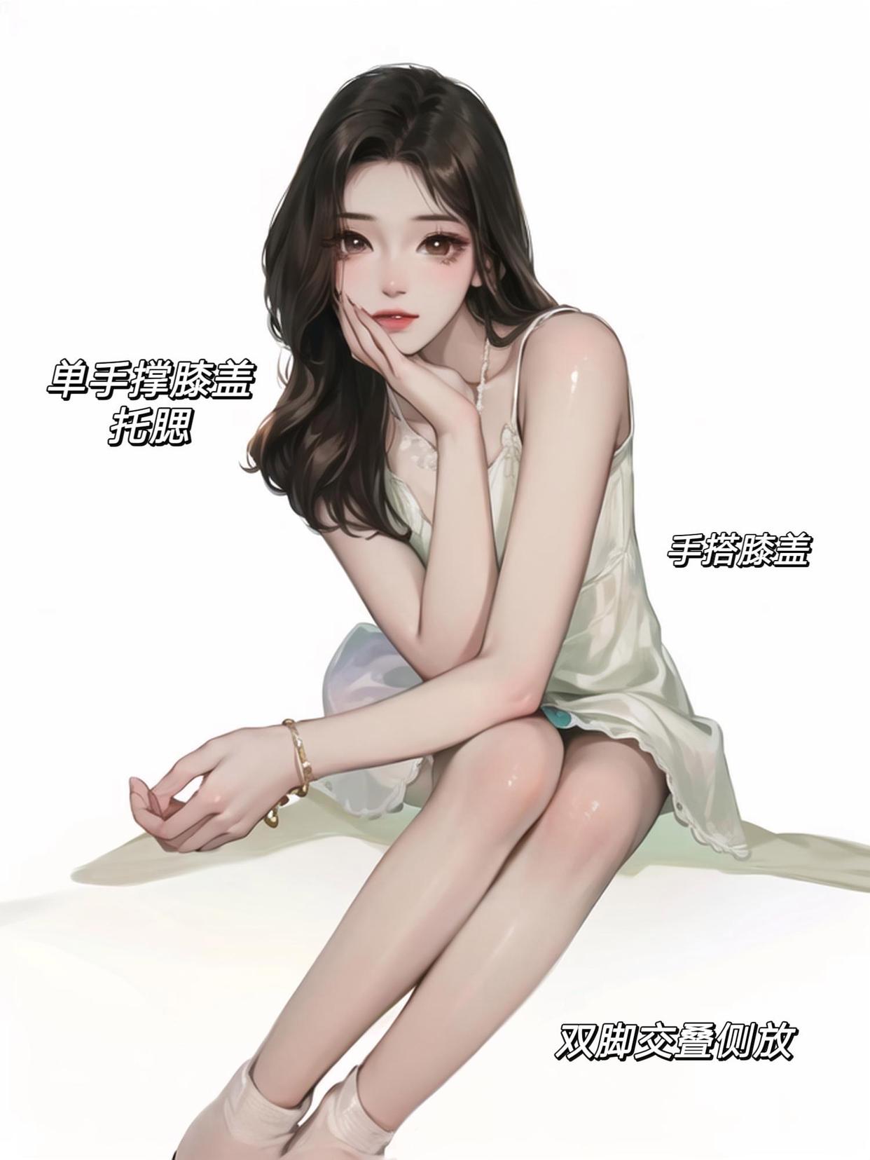 4. 坐着双脚弯曲伸长,单手托腮歪头,一手搭膝盖伸直
