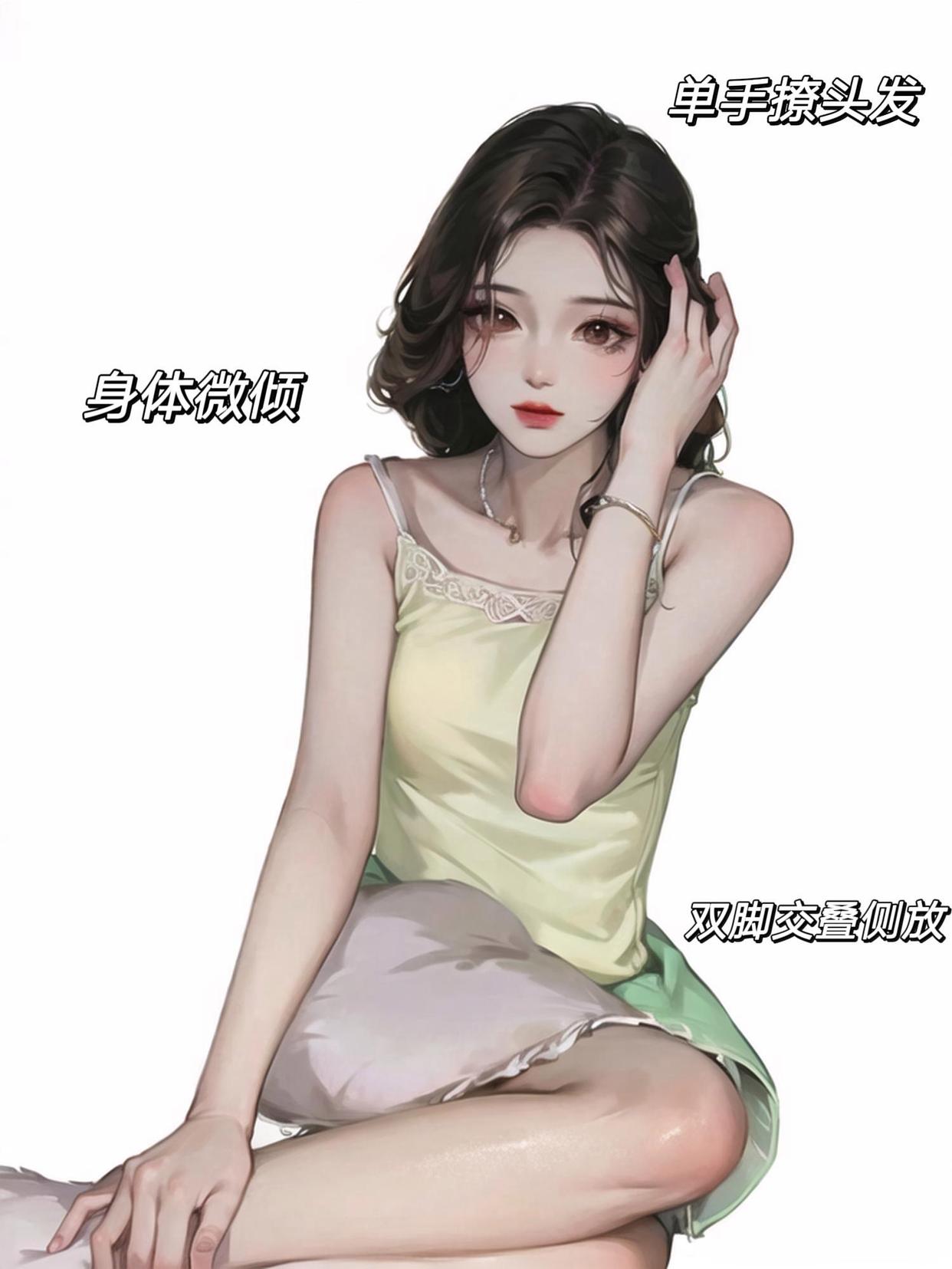 6. 双脚交叠侧放,身体微微倾,单手撩头发