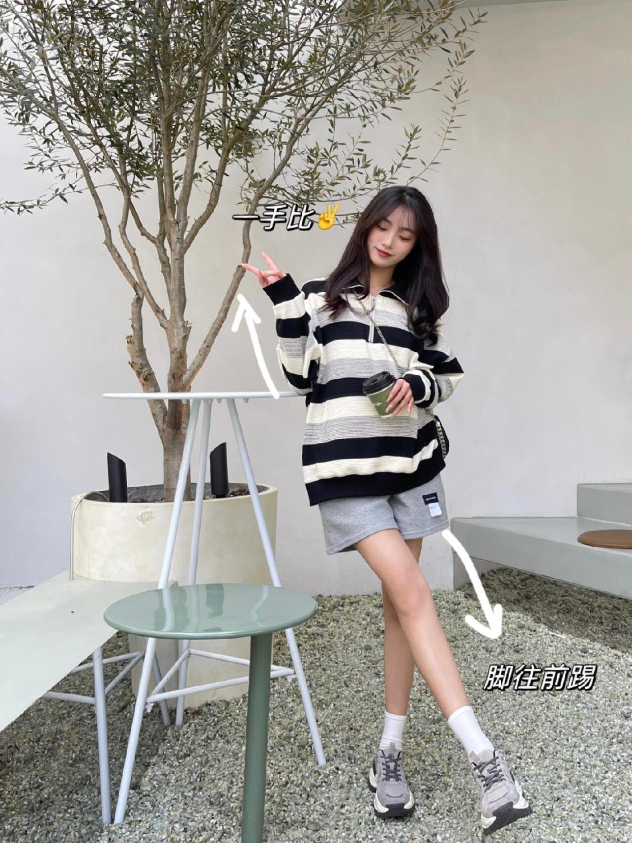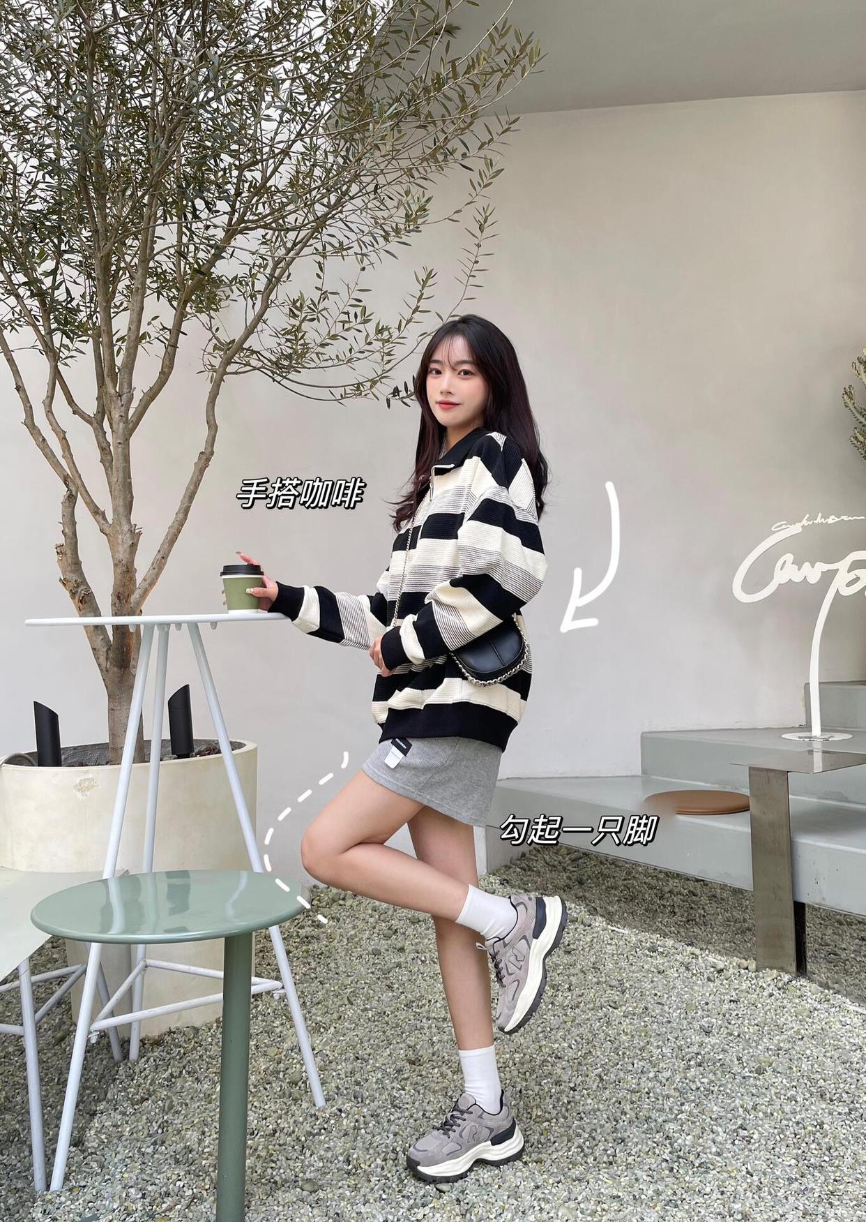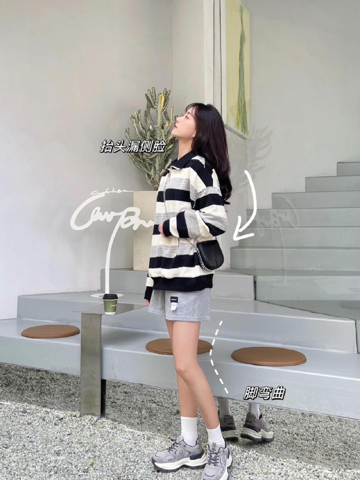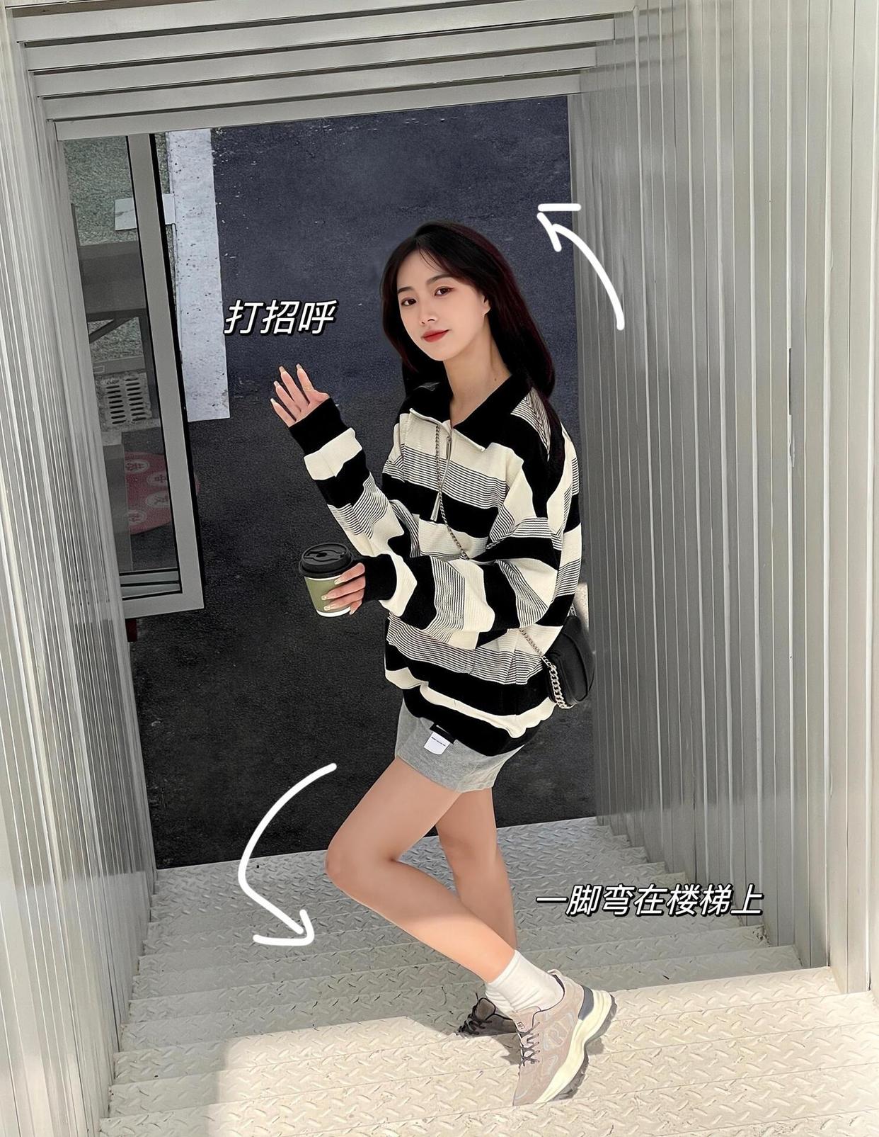 在有楼梯的地方拍照时,可以尝试一脚弯在楼梯上,侧身站立,一手拿着咖啡,另一手回头打招呼。这种姿势不仅让照片显得更有层次感,还能通过动作的互动性缓解拍照的尴尬,让你看起来更加自然,漂亮腿长也显得更加突出。
