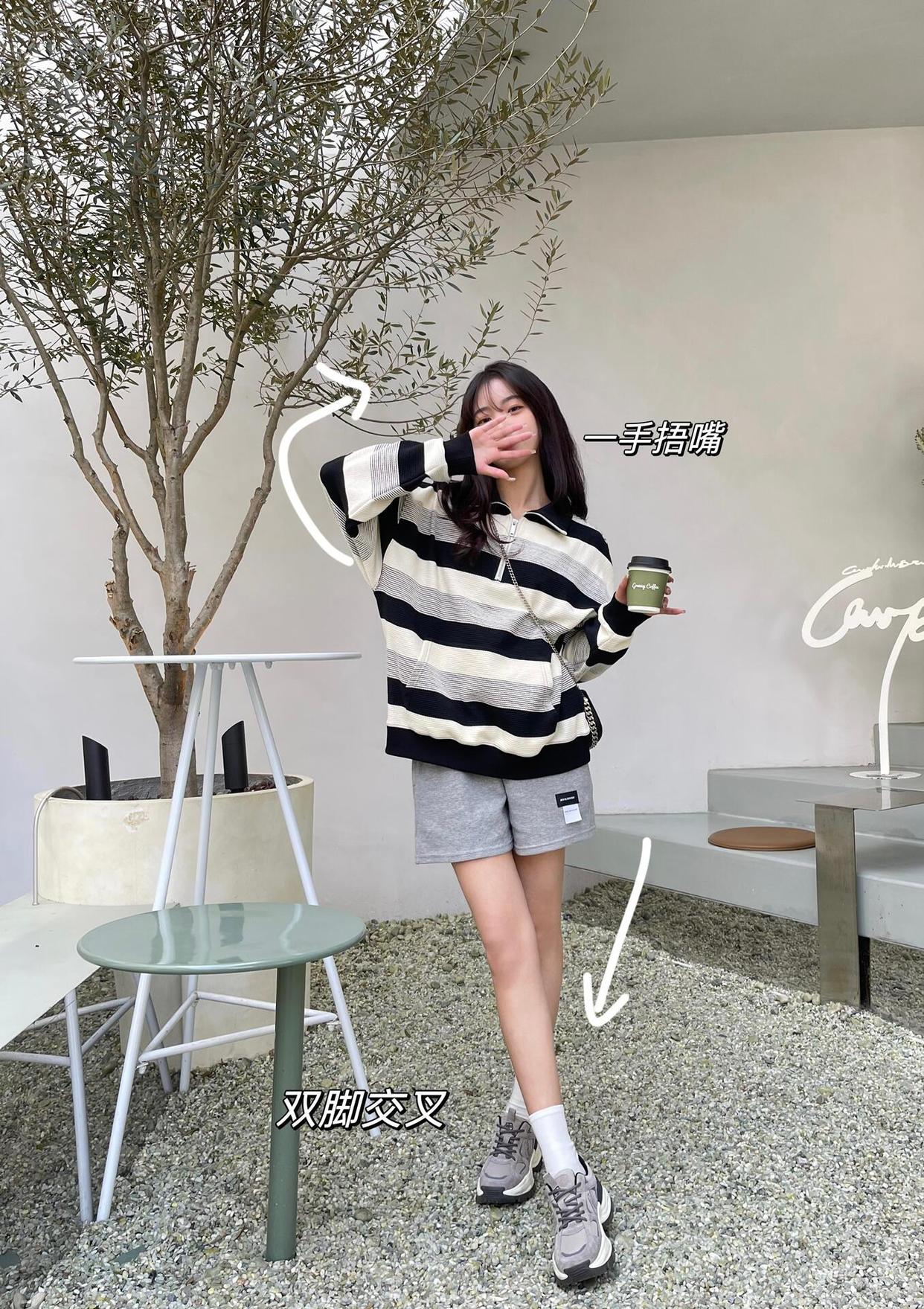 在站姿拍照时,一脚交叉往前轻轻伸出,能够自然地拉长腿部线条,显得腿长又漂亮。单手拿着咖啡,轻轻歪头,不仅让你显得上镜自然,还能缓解拍照时的尴尬感。这种姿势既随性又时尚。
