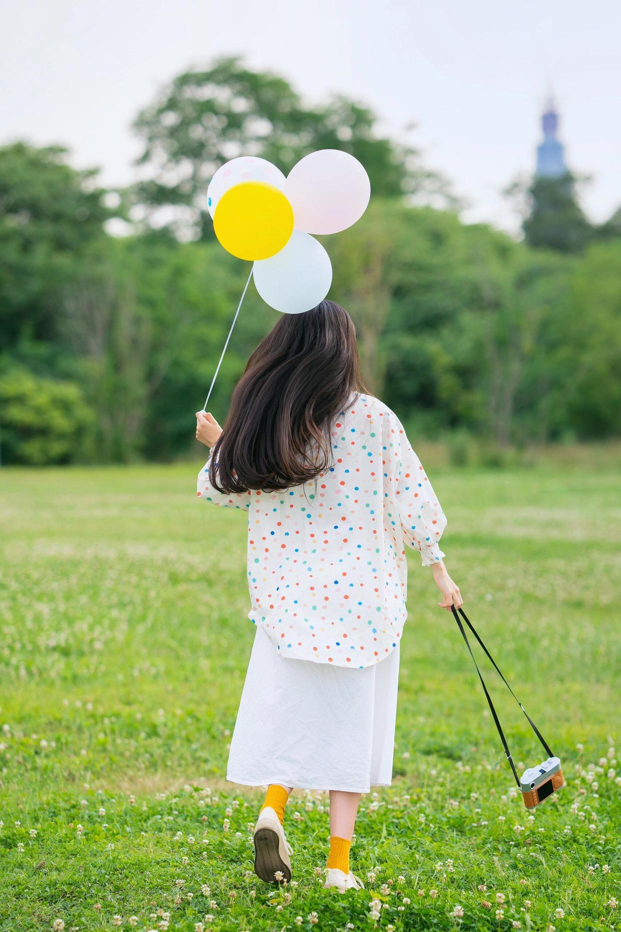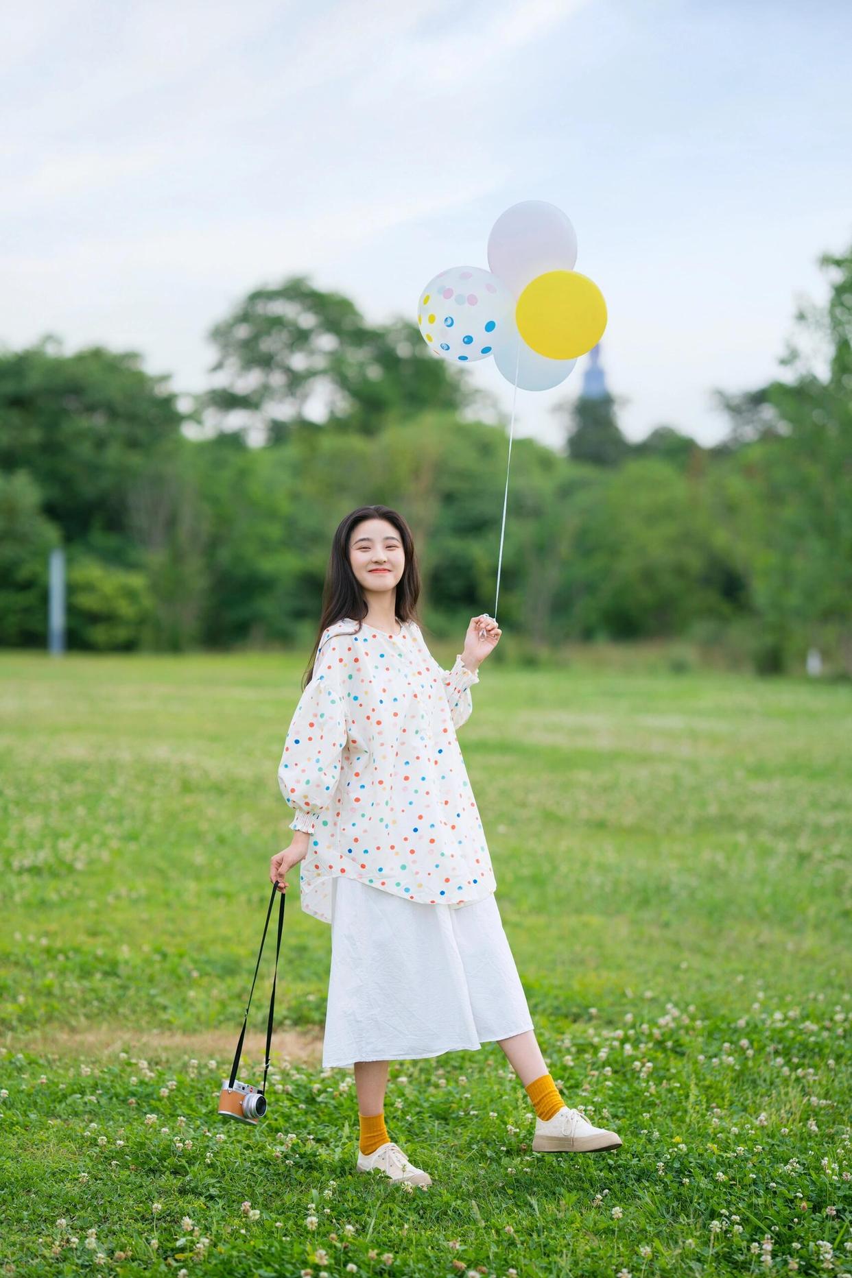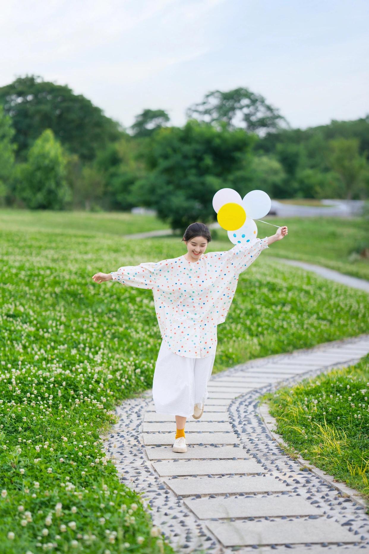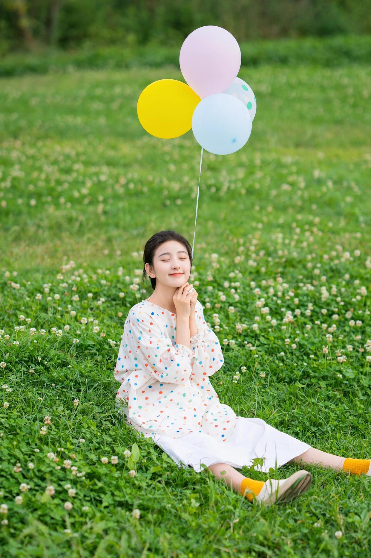 单腿抬起,一手拿着气球,一手拿着小道具,这种姿势不仅能够展现拍照者的个性,还能通过丰富的肢体动作增加照片的趣味性。无论是太阳伞、花束,还是一本书,搭配气球和草地背景,都能让照片显得更加生动且富有情调。