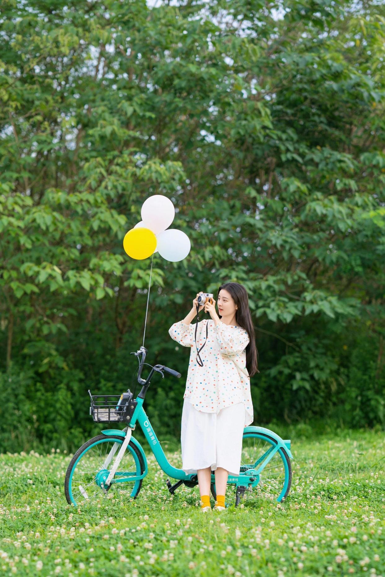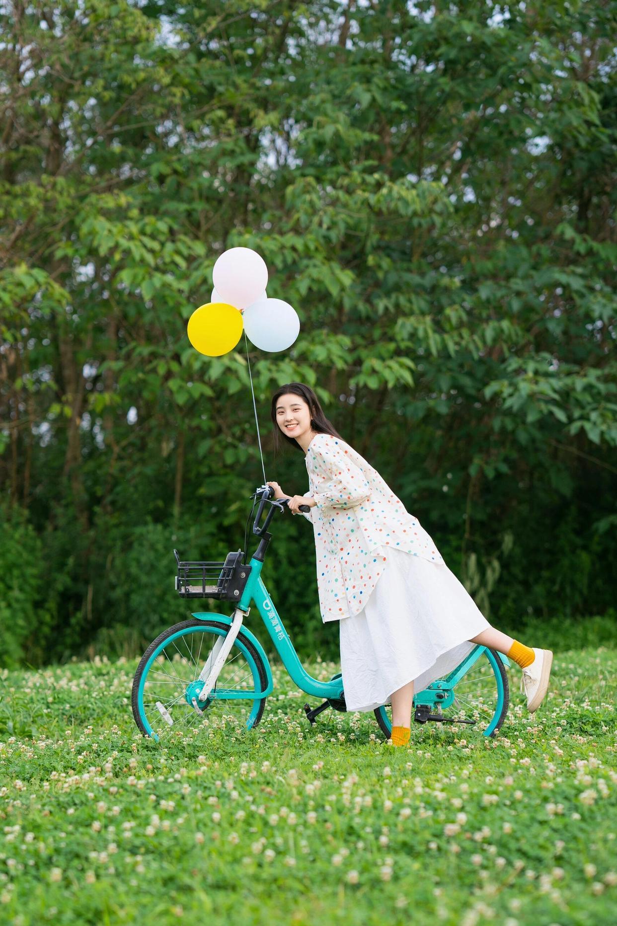 想要拍出更有创意和动感的照片,可以尝试将气球绑在自行车车头,双手模拟骑车的动作,同时侧向抬起一只脚。这个姿势非常适合在草地上的小道边拍摄,不仅突显了拍照者的活力与青春,还能通过巧妙的构图让画面充满动感和层次感。