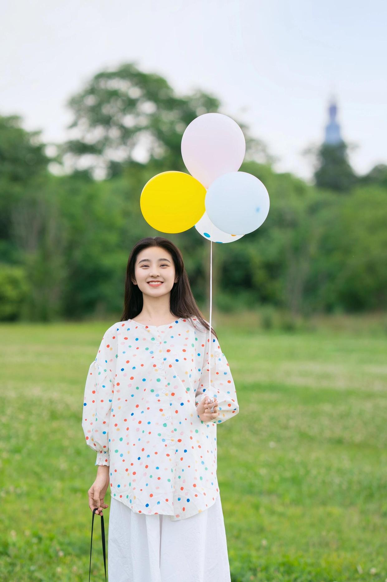 正面镜头拍摄时,拿起气球,展现出最自然的微笑。这一姿势简单却充满感染力,尤其是在明亮的日光下,气球的鲜艳色彩能够与绿色的草地形成强烈对比,使整张照片更显得明快活泼。微笑不仅让拍照的人显得亲切迷人,还能够传递出内心的喜悦和轻松感,给人一种温馨的氛围。