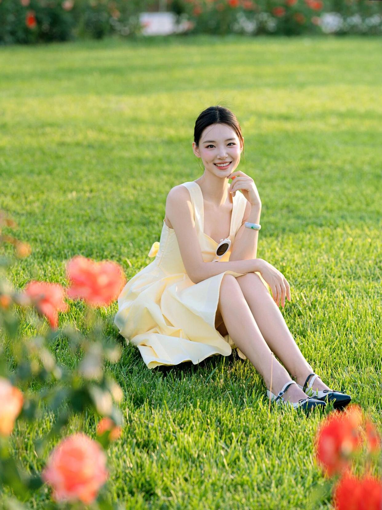 侧身坐在公园草地上,一手托腮,露出甜美的笑容。这个姿势非常适合拍出温柔甜美的照片,给人一种亲切感,气质很漂亮。