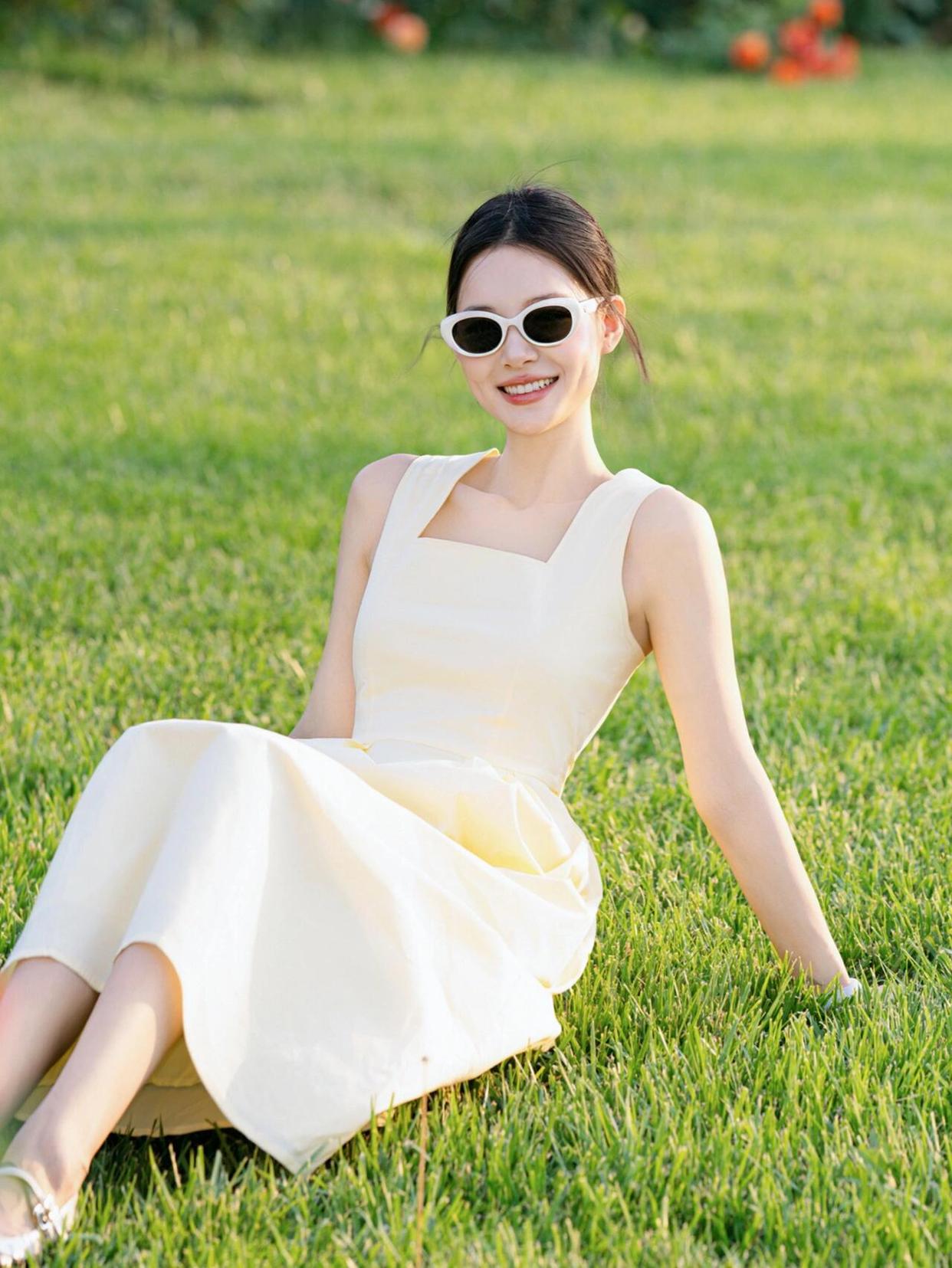 坐在草地上,双手往后撑地,身体微微向后倾,露出自然的微笑。这个姿势可以展现出你轻松愉悦的状态,给人一种随性自然的感觉,配合一个好看墨镜很漂亮有气质。