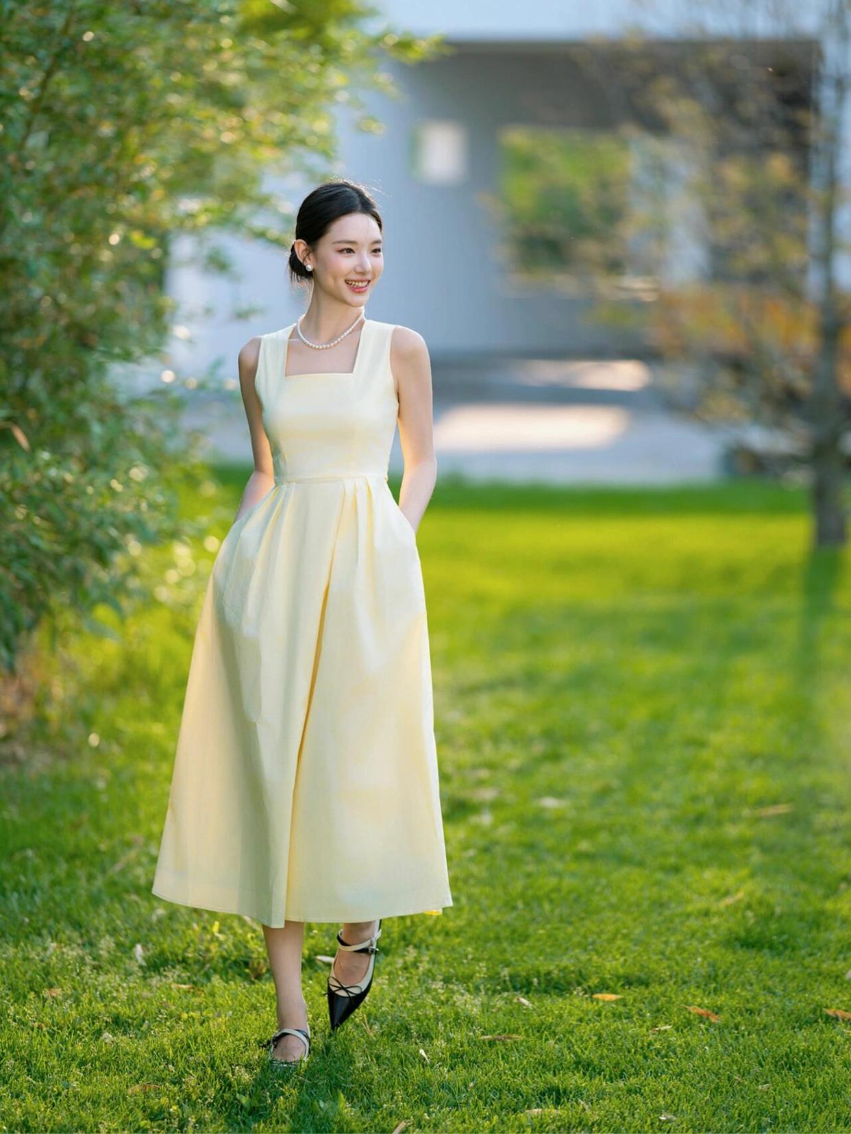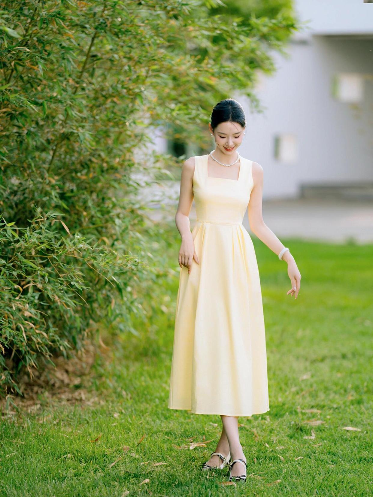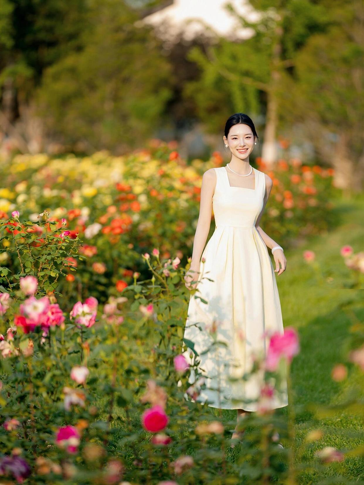 站在草地上,双腿交叉,低头微笑看向脚下的草地。这个姿势显得非常温柔,低头的动作可以让你的脸部线条更加柔和,整体感觉非常自然优雅有气质。
