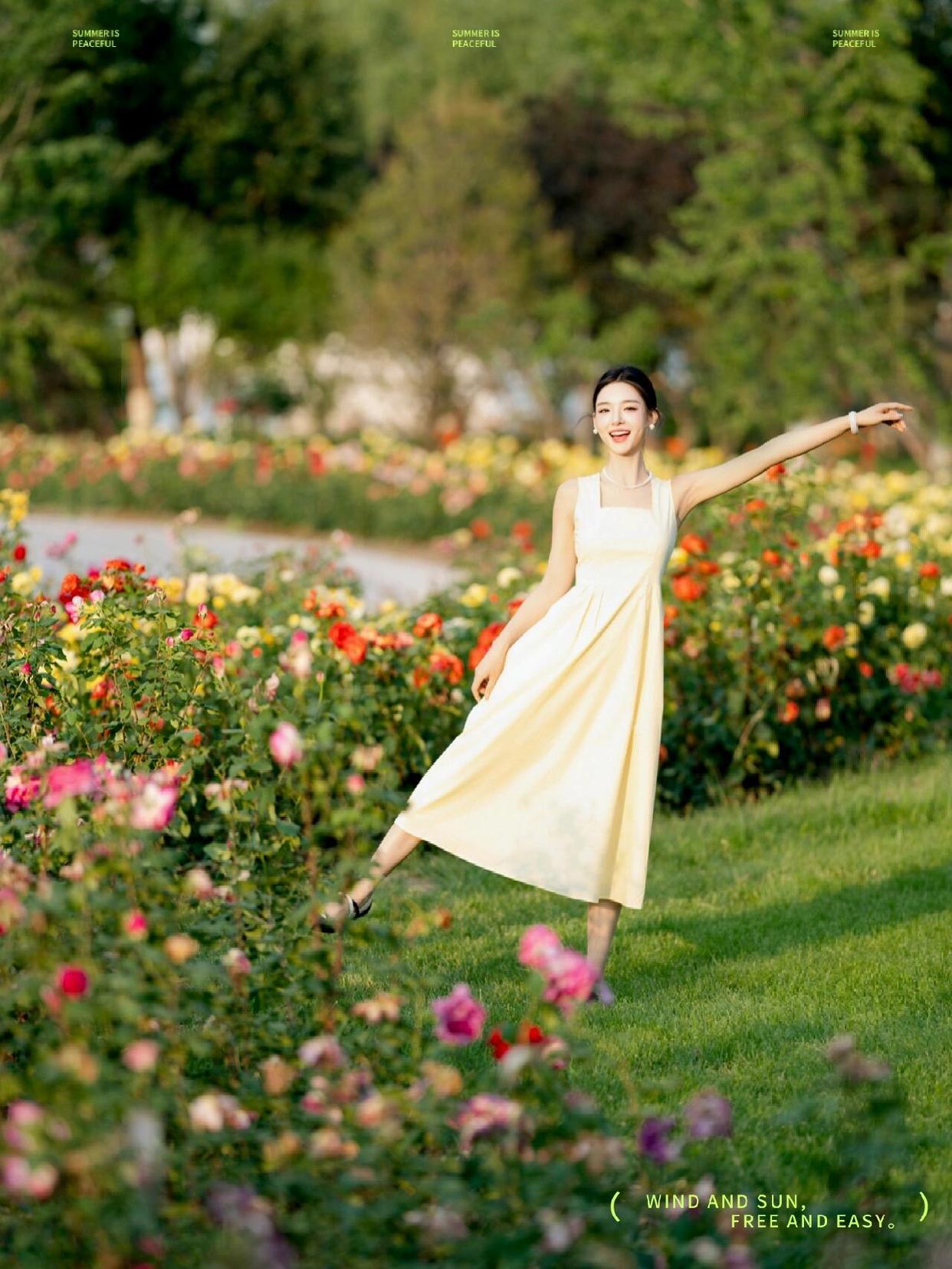 穿着裙子的女生可以试试这个姿势。站在草地上或者花丛中,一手轻轻提起裙摆,露出自然的笑容。这样不仅显得优雅,还能展现出你的活泼和青春气息,很漂亮有气质。