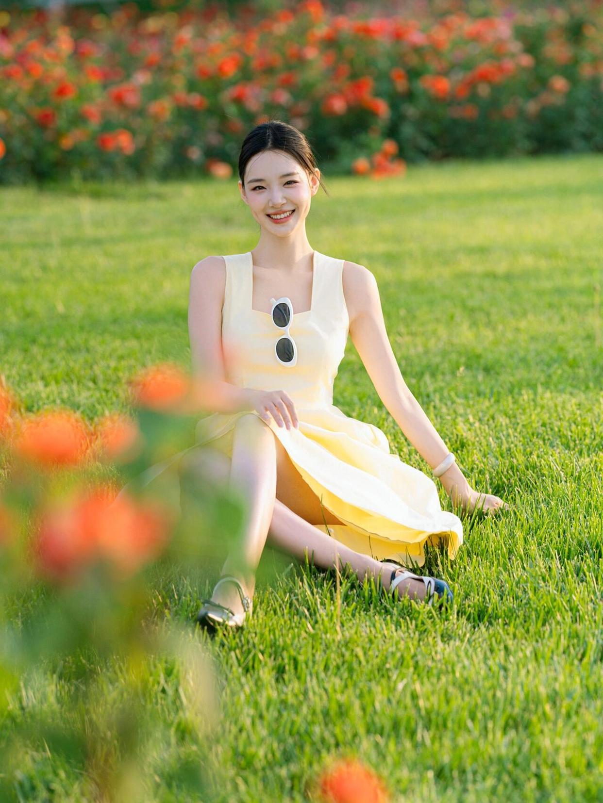 盘腿坐在草地上,微笑着看向远方。这是一个非常经典的姿势,在公园拍照,配合利用花花做前景的话,既自然又不失优雅,特别适合拍出静谧而美好的氛围感。
