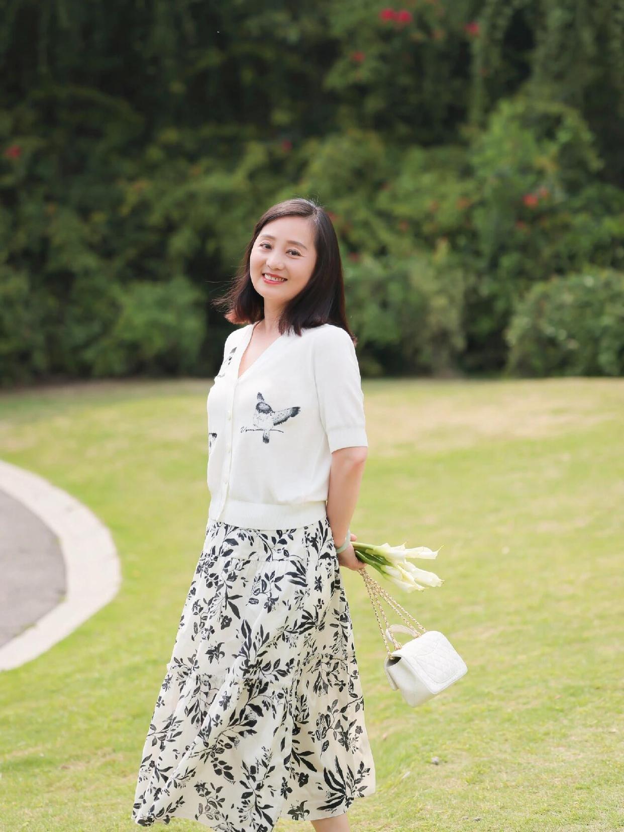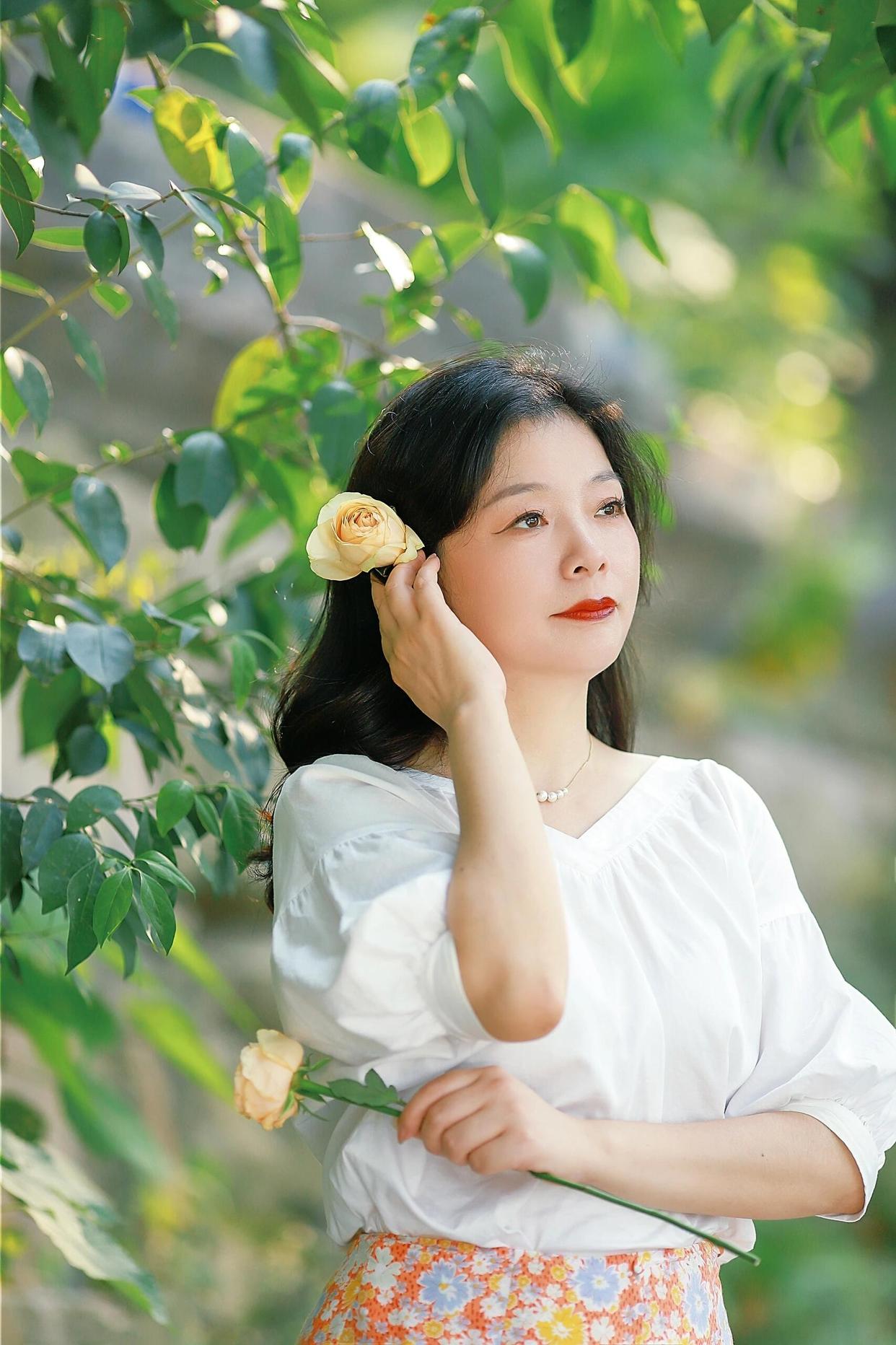 中年女士拍照,可以手拿一束花,侧身站立,看向远方。花朵的点缀可以让照片更加温馨柔美,突显女士的温婉气质。选择一个花园或绿地、树林作为背景,照片显得自然好看,非常有意境。