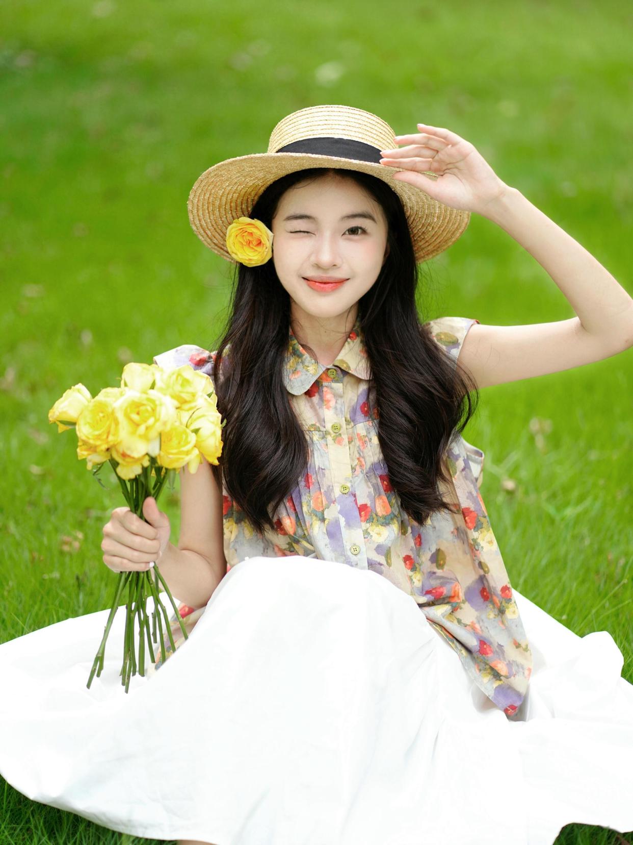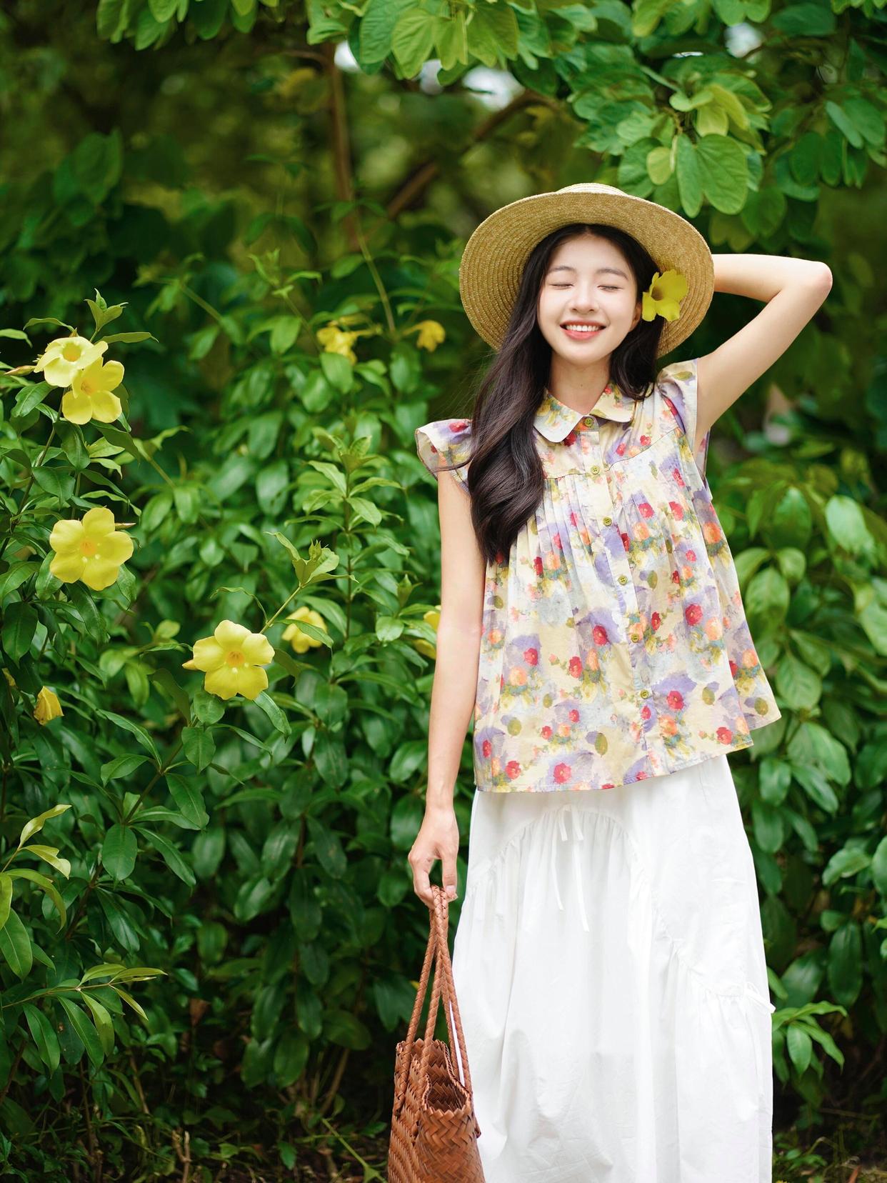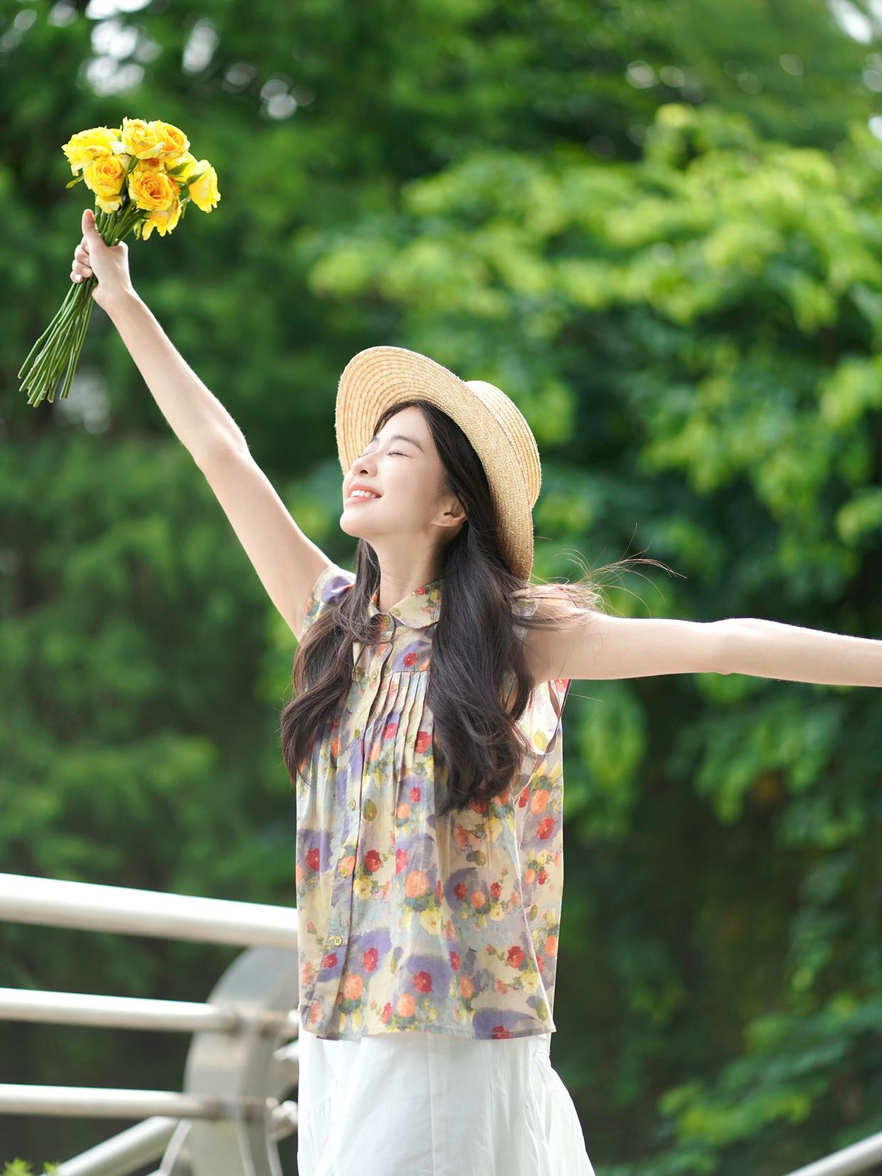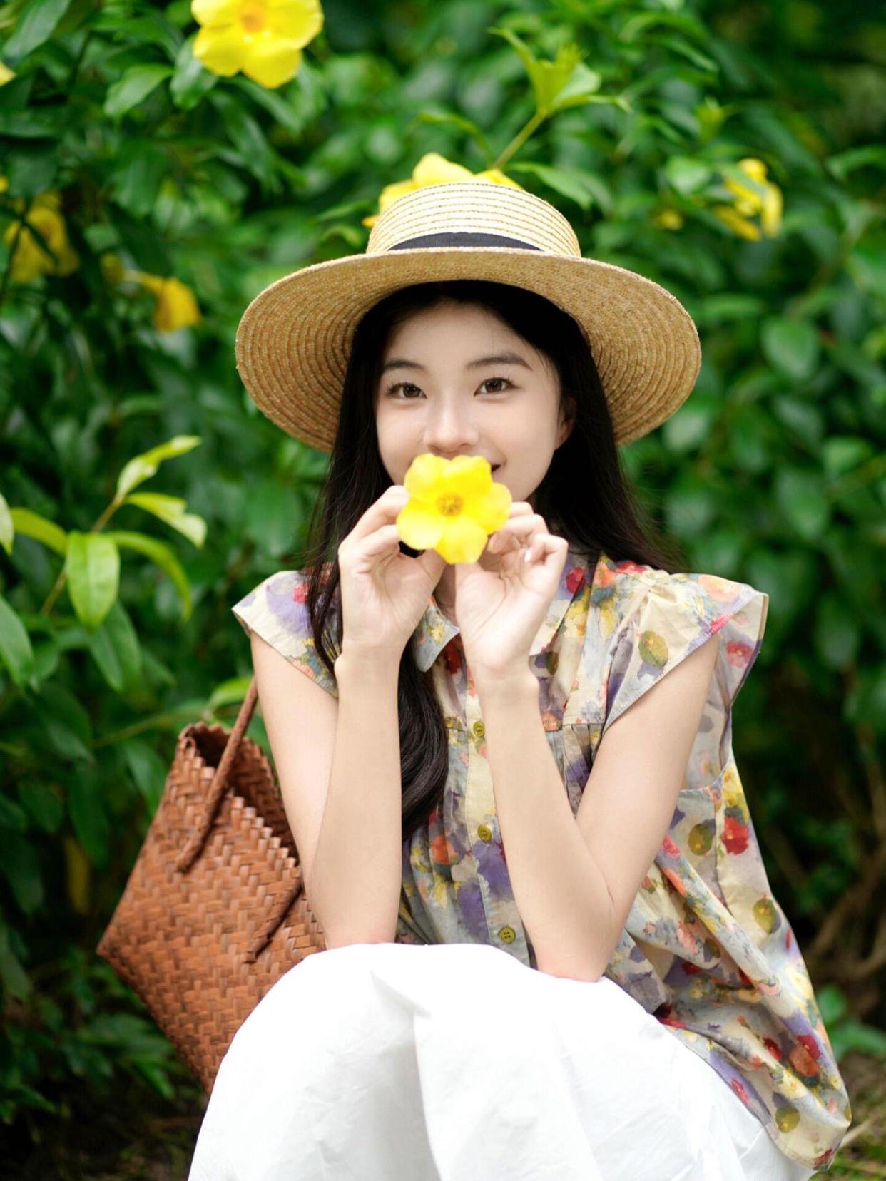 在夏天拍花时,带上一顶草帽会是很好的选择。用手轻扶帽子,闭上眼微笑,这样的姿势能展现出一种宁静与温暖的感觉。配合明媚的阳光和美丽的花朵,照片会显得特别温馨且很好看,很有氛围感。