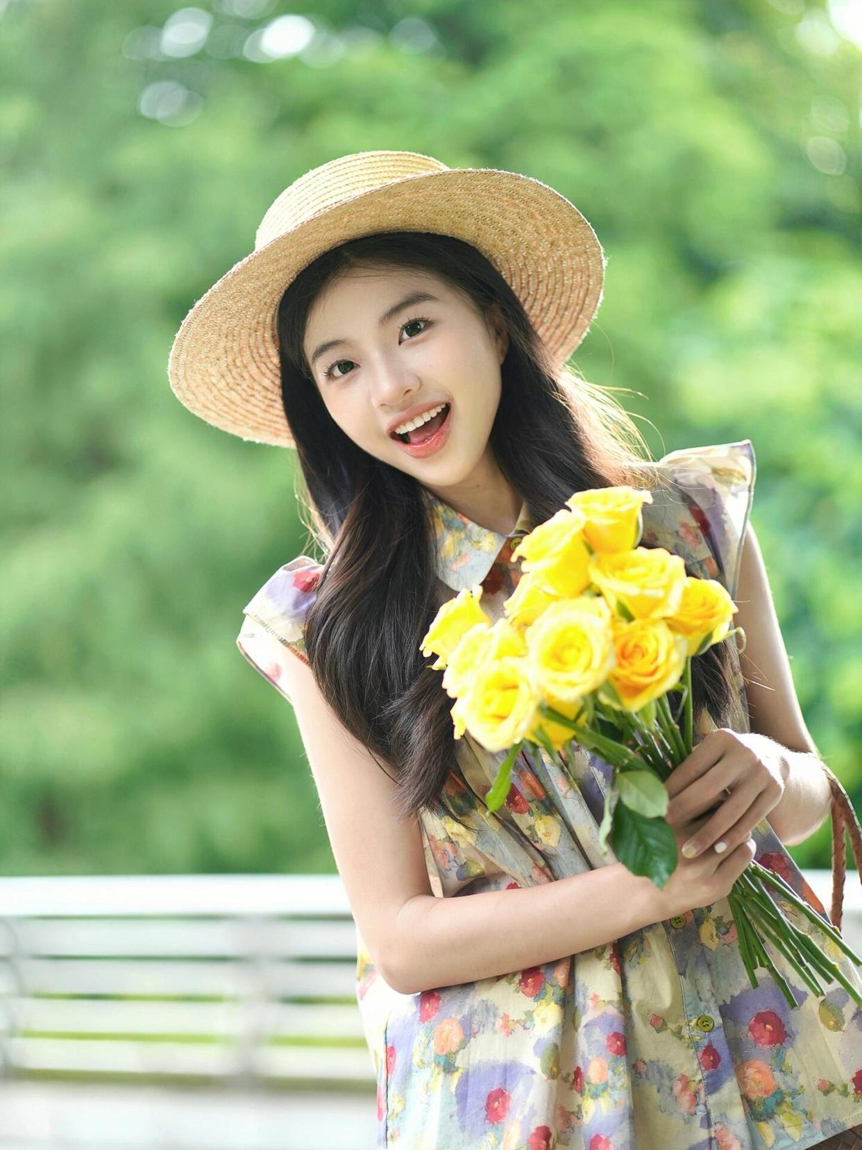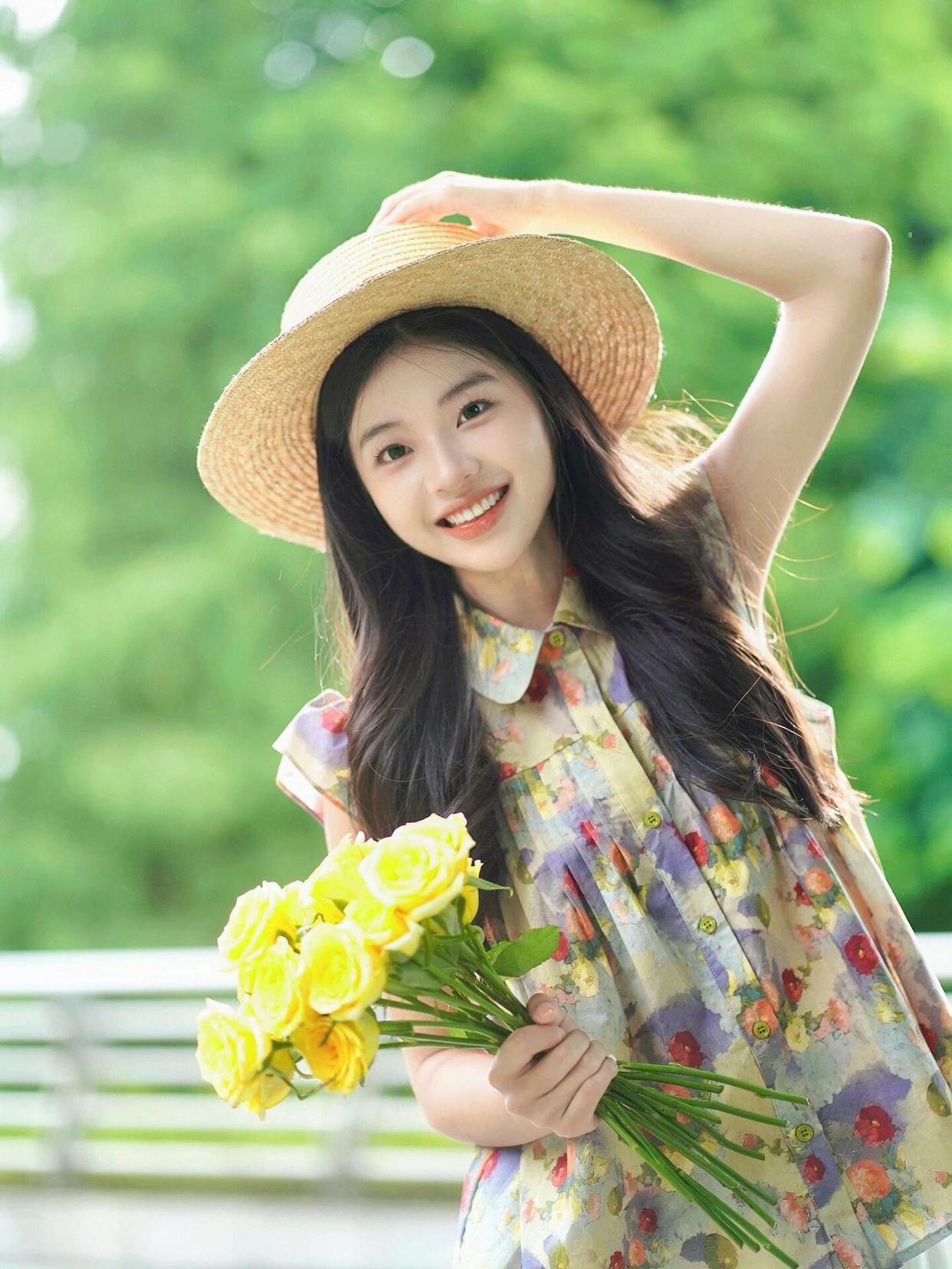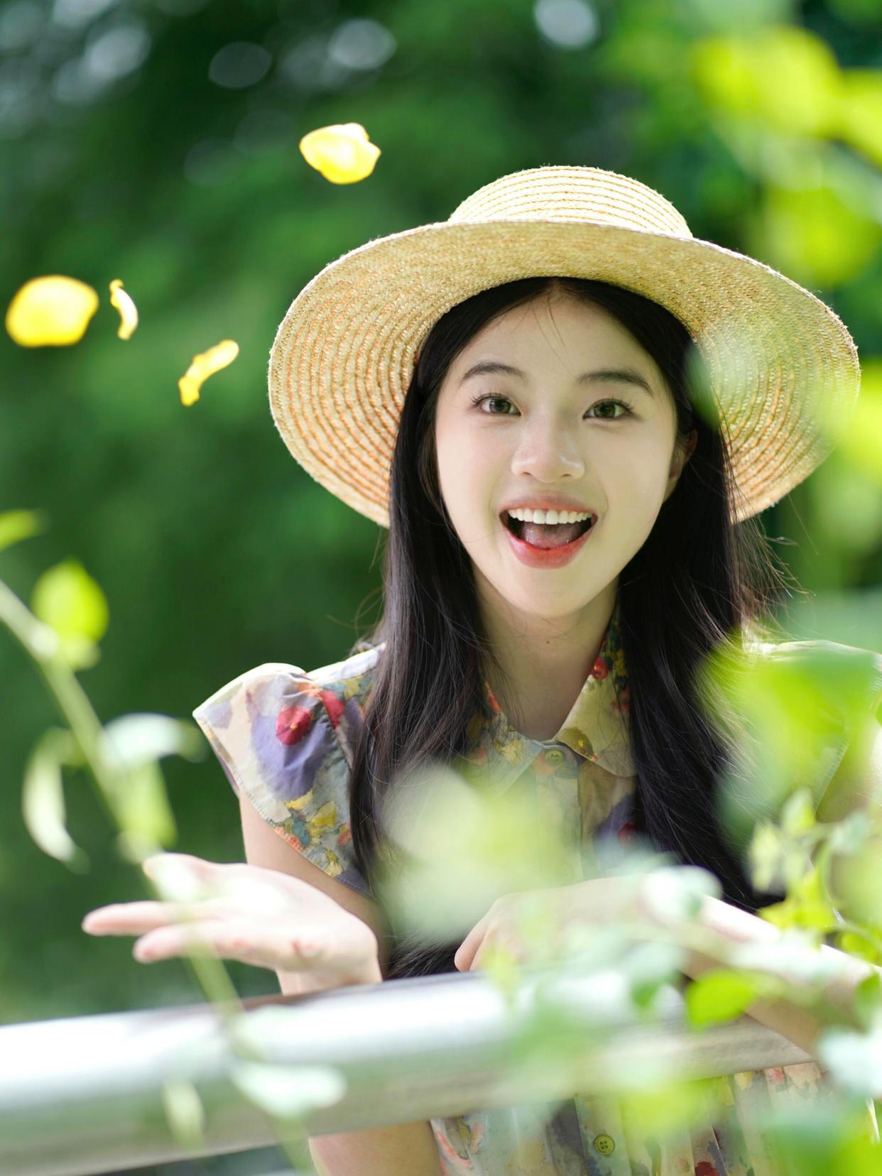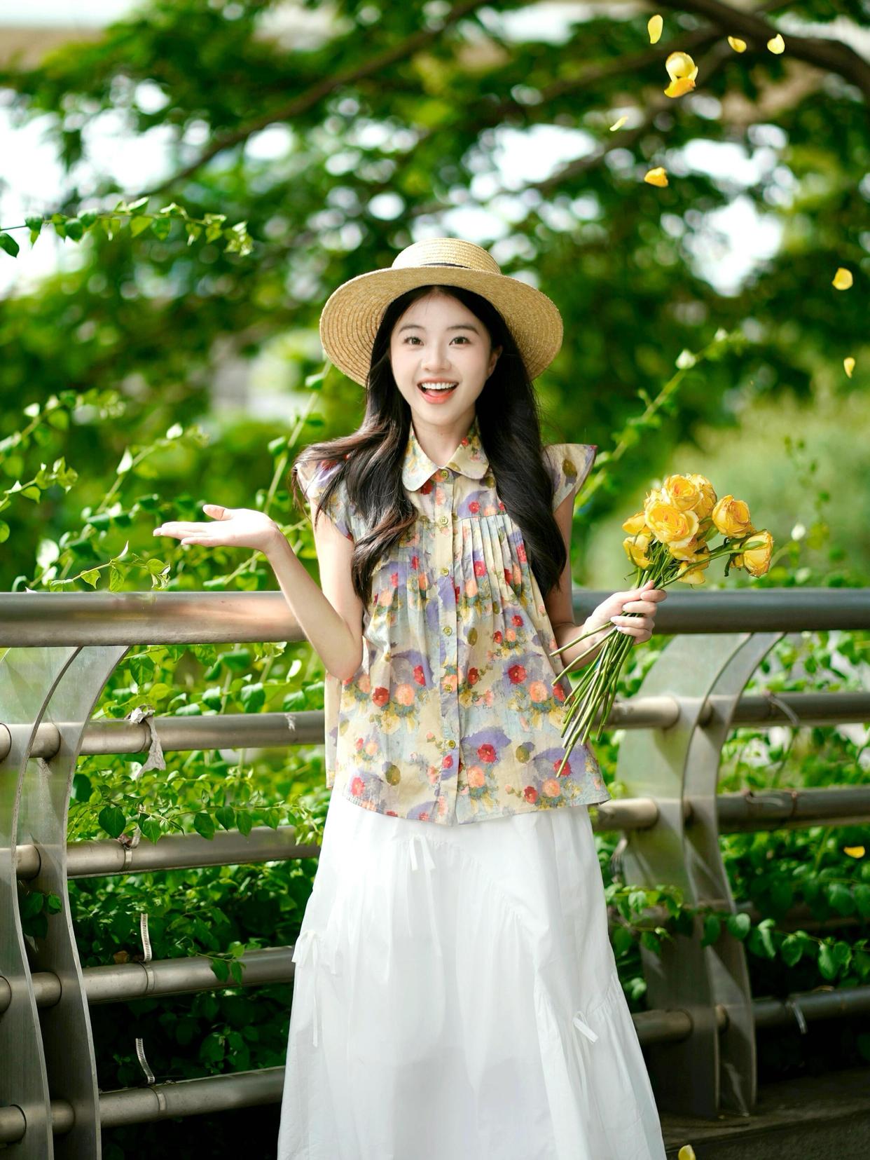 在夏天拍花时,带上一顶草帽会是很好的选择。用手轻扶帽子,闭上眼微笑,这样的姿势能展现出一种宁静与温暖的感觉。配合明媚的阳光和美丽的花朵,照片会显得特别温馨且很好看,很有氛围感。