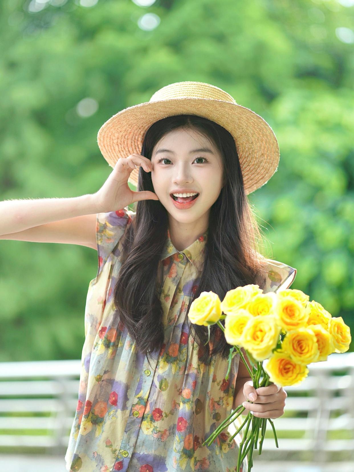 手持鲜花,另一只手在脸颊旁比一个心形,这样的姿势既可爱又俏皮。无论是对着镜头还是微微侧身,这个姿势都能让你显得特别甜美,拍出的照片也会非常讨人喜欢,氛围感满满。