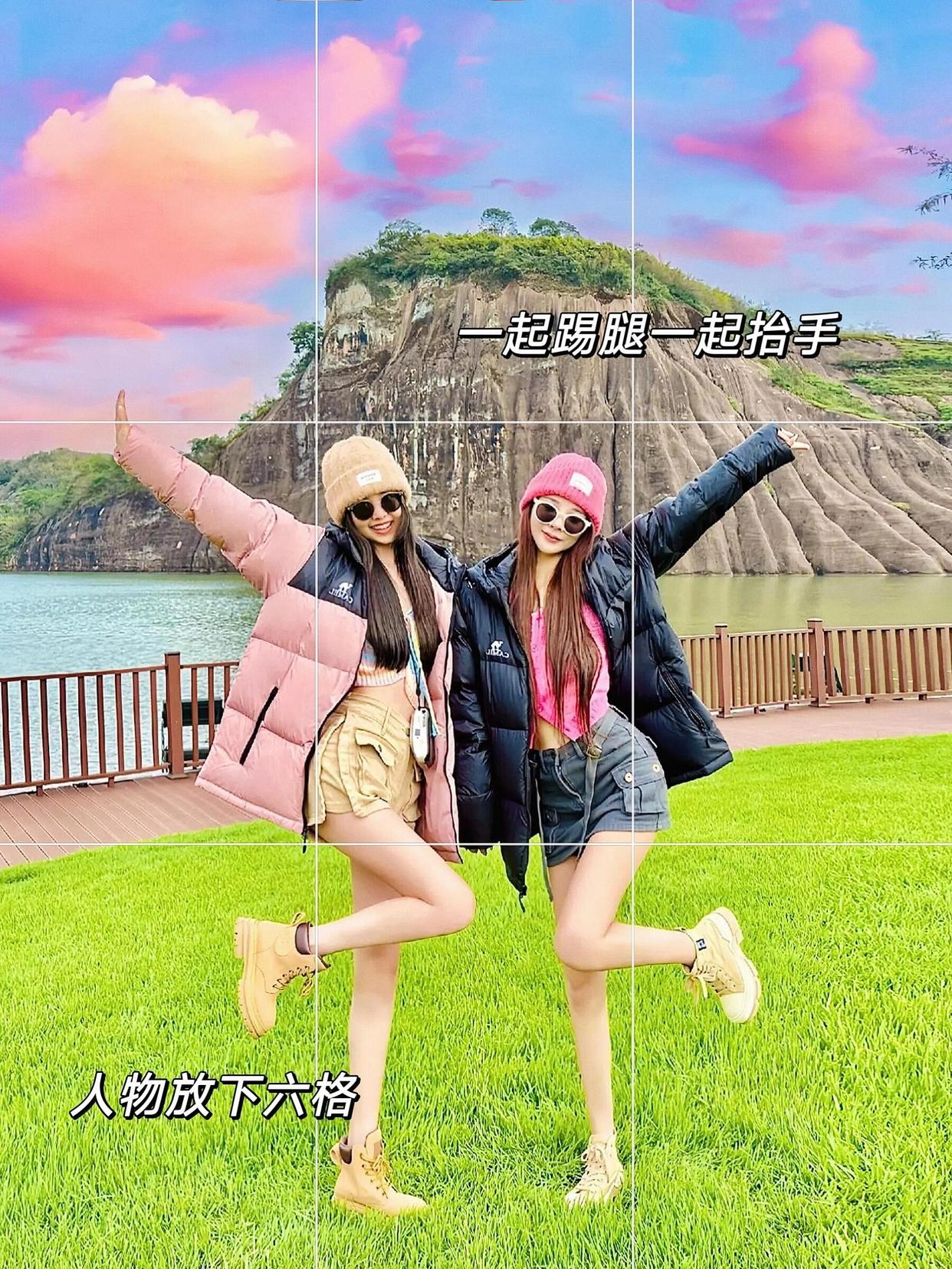 两个人居中构图站着,一个人面对镜头撩头发,另一个人侧身回眸。这种姿势非常显瘦,也能突出姐妹之间的互动。撩头发的动作自然且充满魅力,而侧身回眸则显得优雅和神秘,适合各种场合的拍照需求。