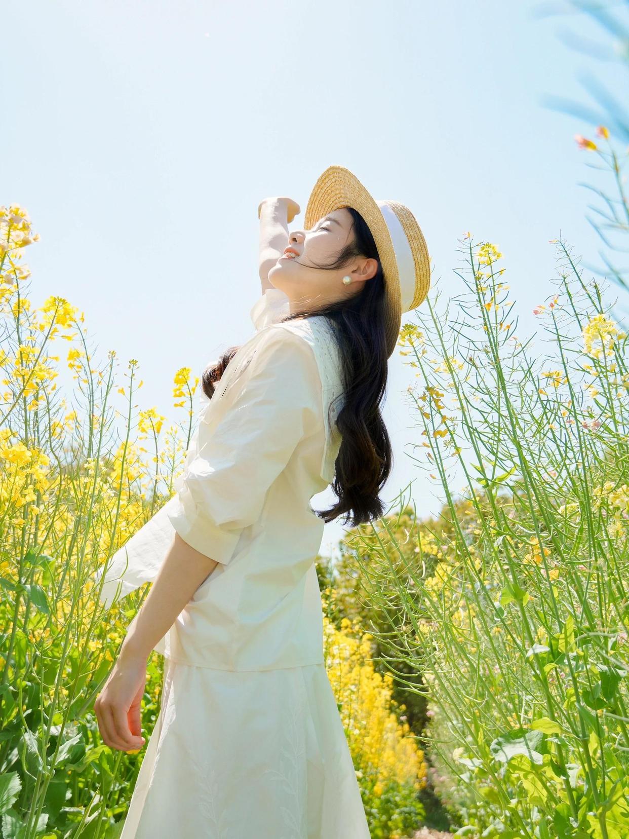 到油菜花田拍人像,帽子可以说是必备的拍照道具了,而且,”手撑帽檐对镜笑”这一动作设计具有典型的时尚大片风格,同时也流露出轻松愉快的氛围。