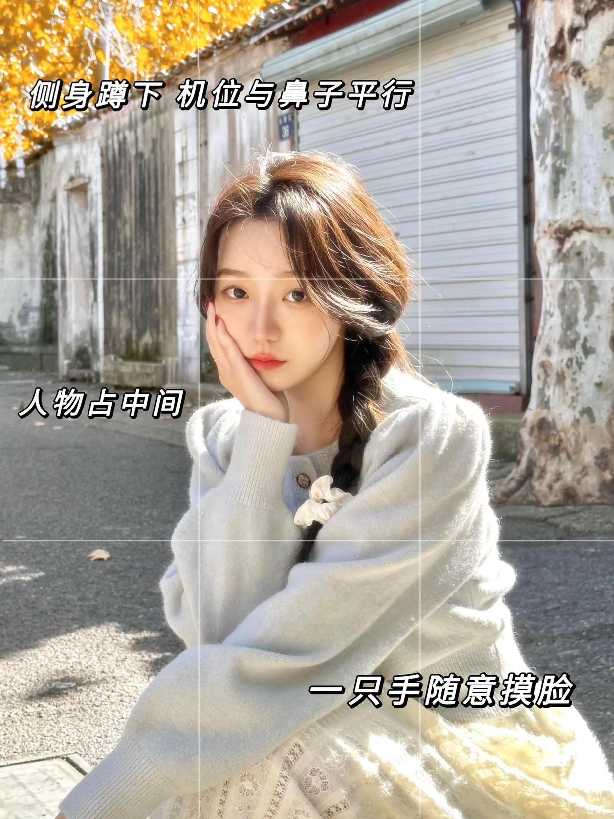 以近景或特写拍人像的时候,面部的细节会被放大,这种时候,可以让模特侧身蹲下,机位与鼻子平行,将自己的侧颜展现给今天,一手搭膝盖,另外一手随意摸脸,这样拍照,既能实现扬长避短,也能拍出慵懒、随性的美。
