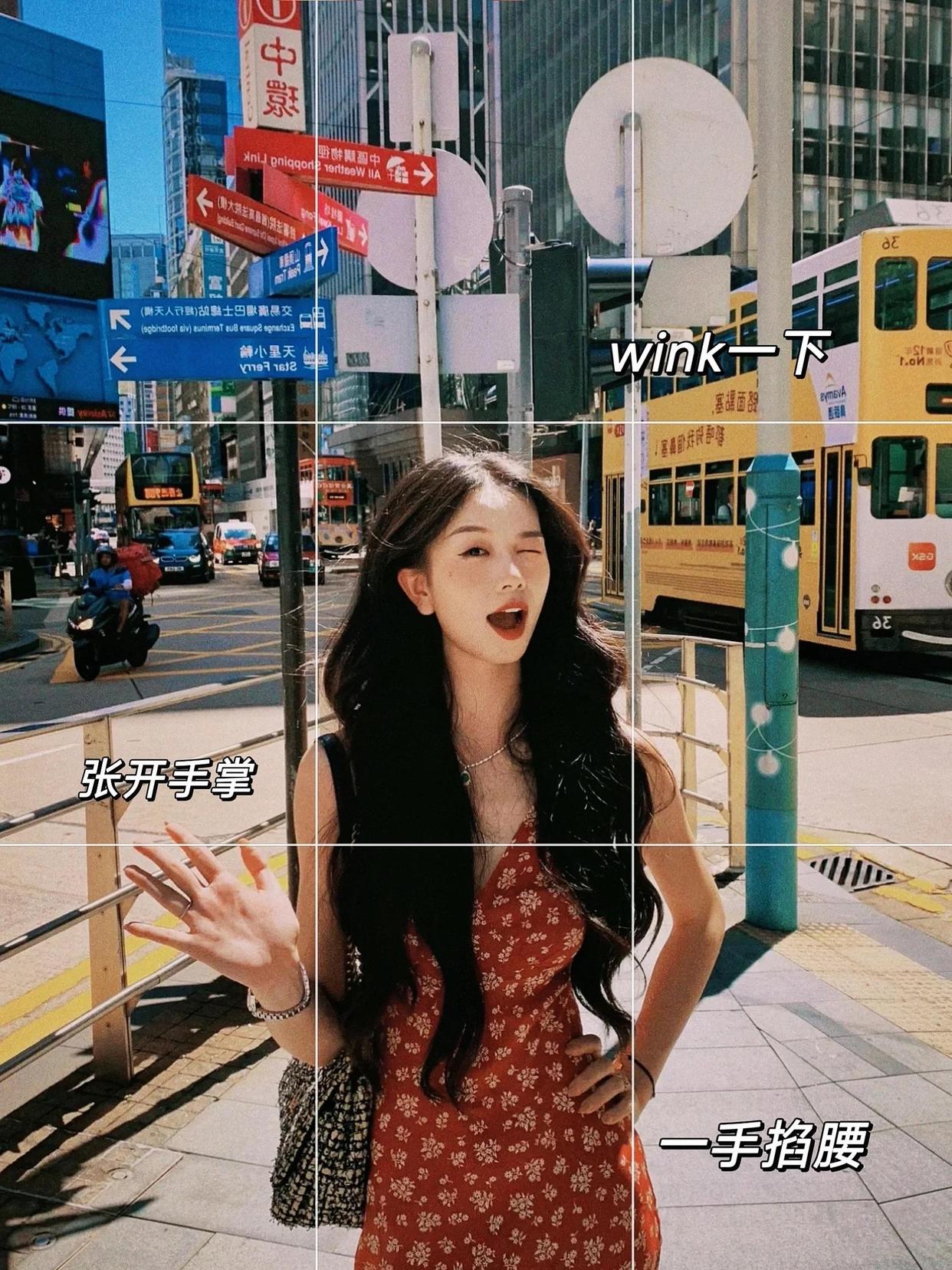 尽量不要两手都举起,可以像下面的模特一般,一手放于胯部,一手举起比耶,姿势简约好看,出片又高又美。