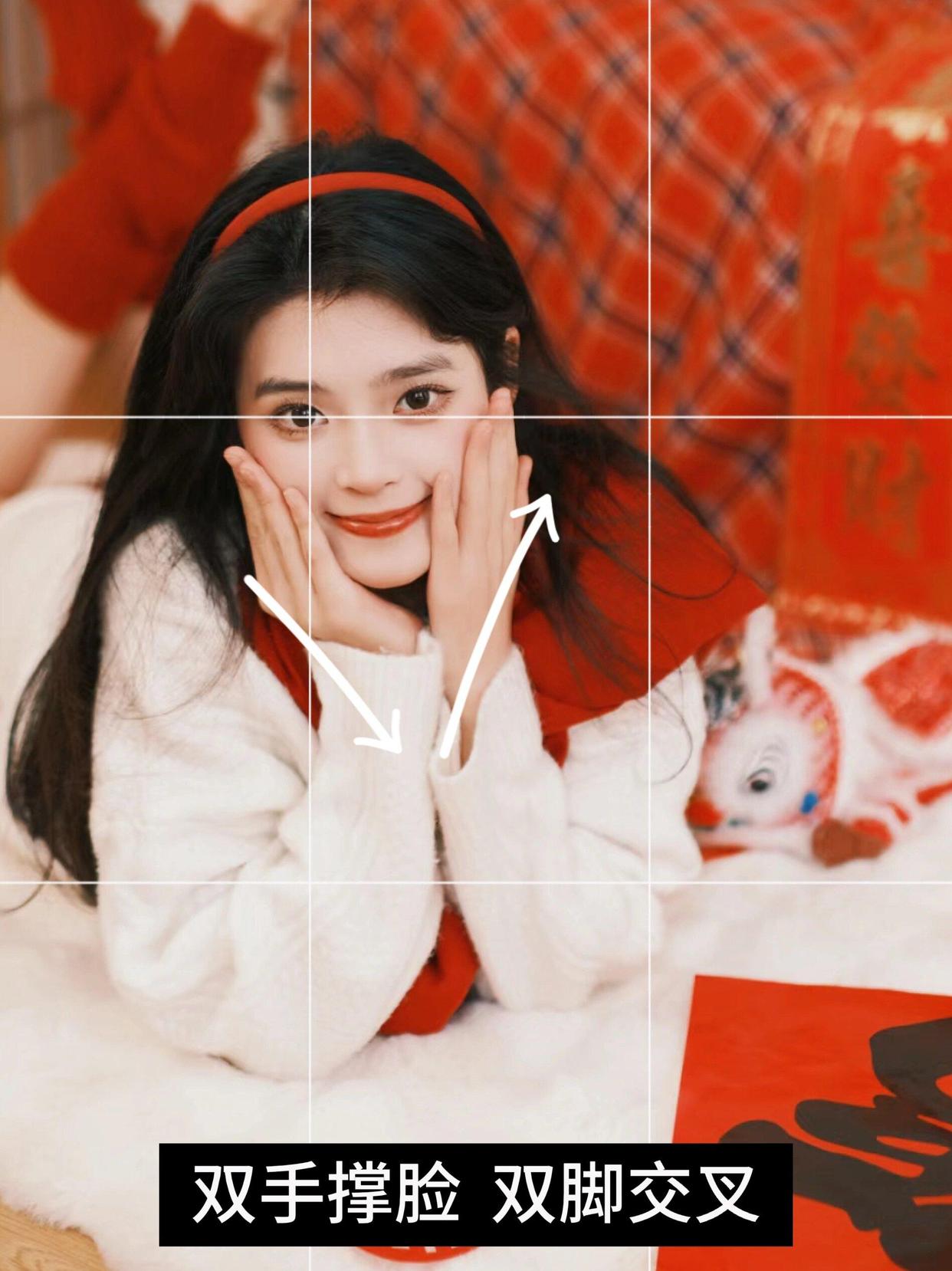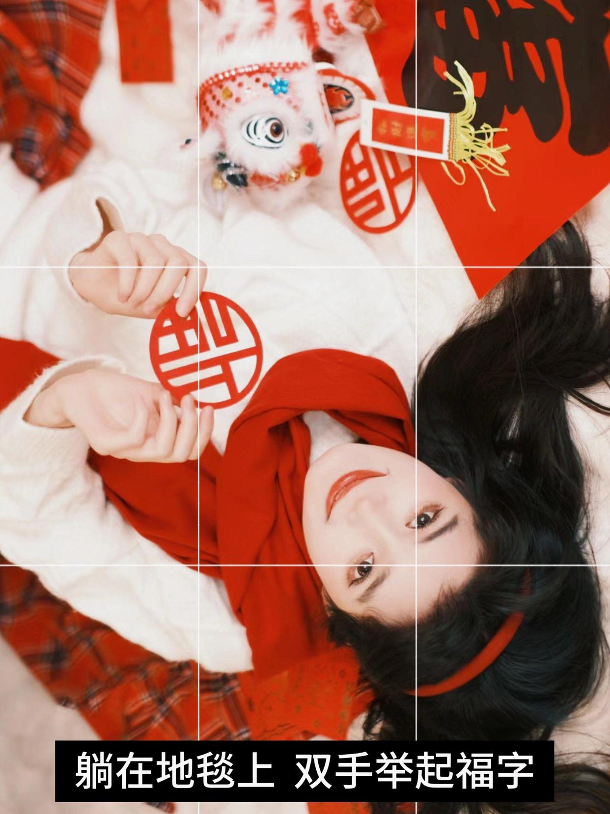 在一张舒适的地毯上躺下来,将双手举起一个”福”字,体现出对新年的祝福和美好的希望。这个姿势可以展现你的轻松自在和对新年的美好期待,这样的角度也特别有意思,搭配服饰拍出新年氛围感满满。