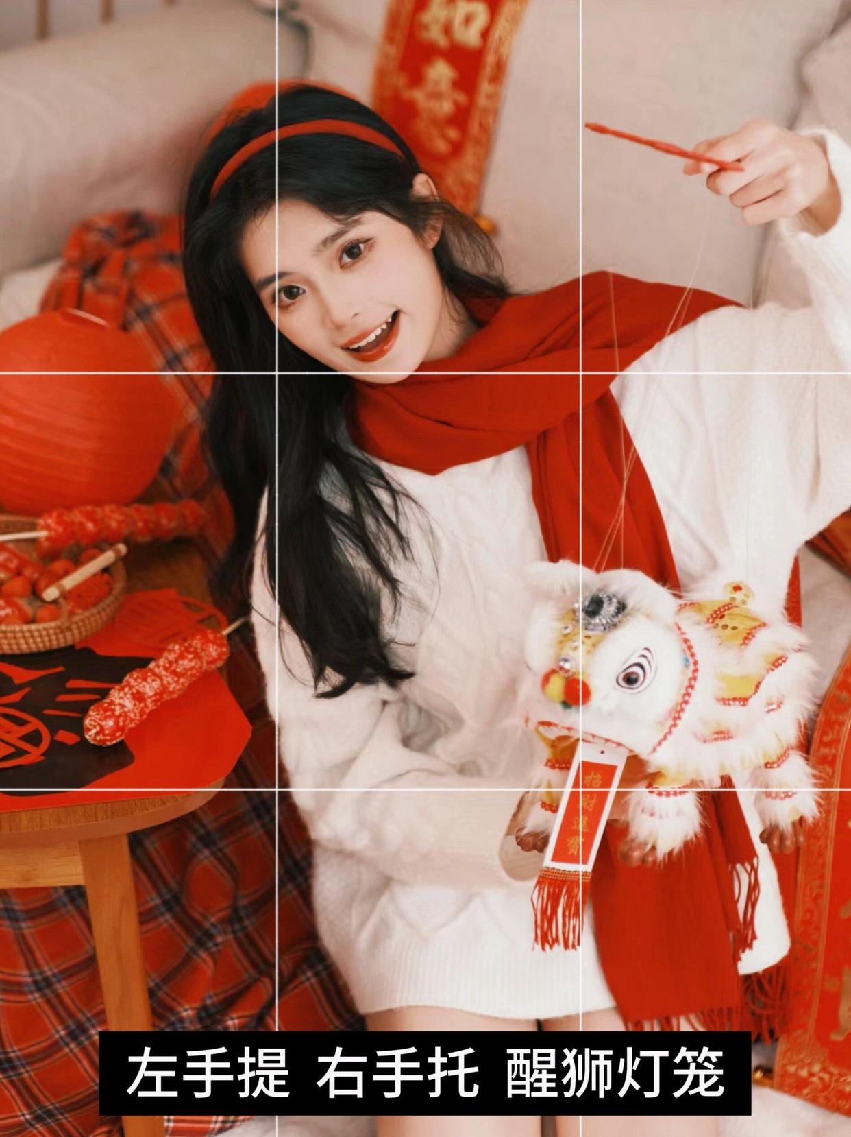 找一个醒狮灯笼,将其左手提起,右手托住。这样的姿势既展示出你与醒狮的亲密互动,又体现出对新年美好的祝愿和希望。