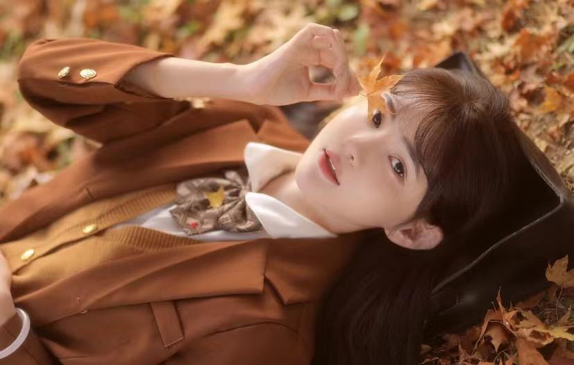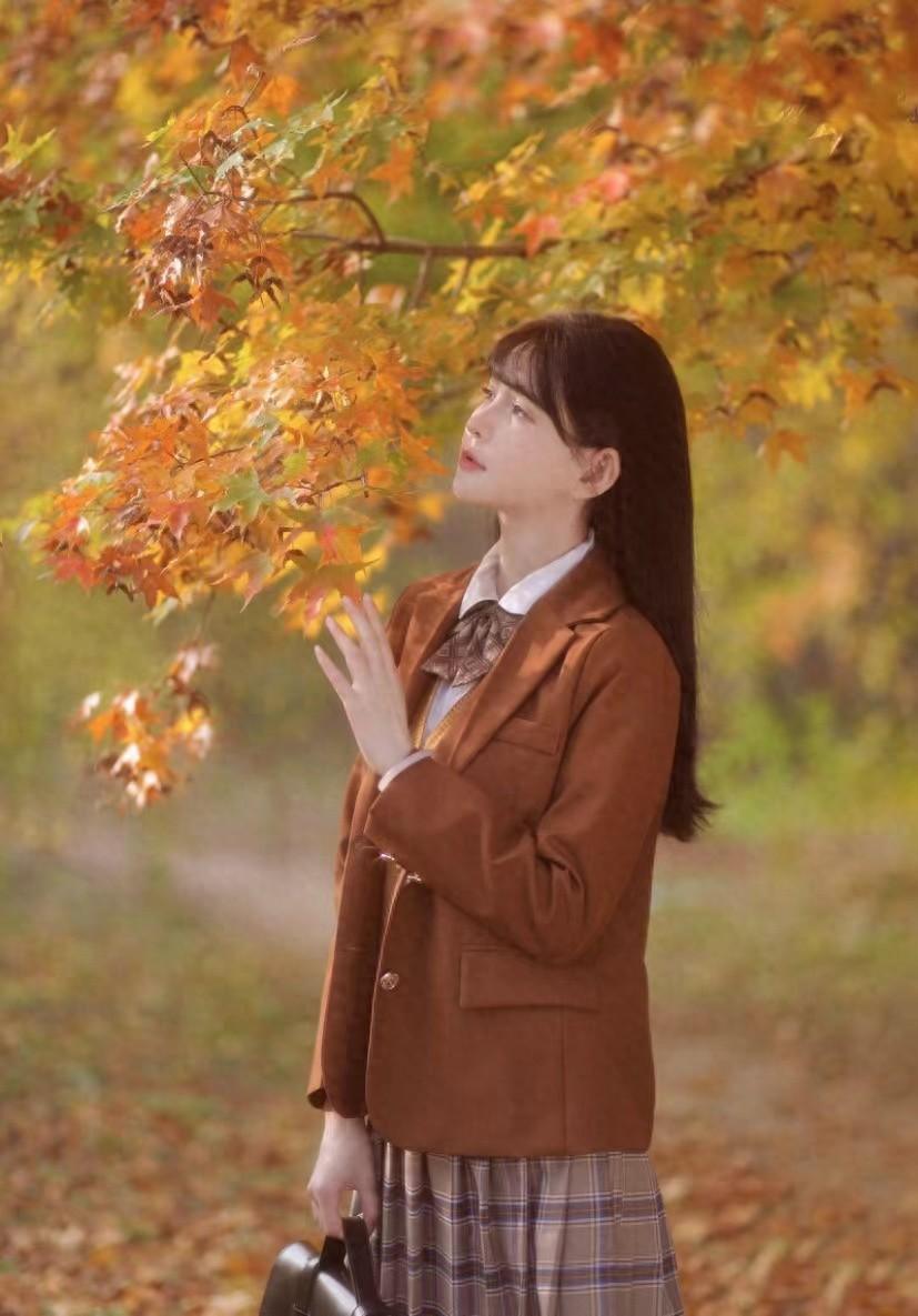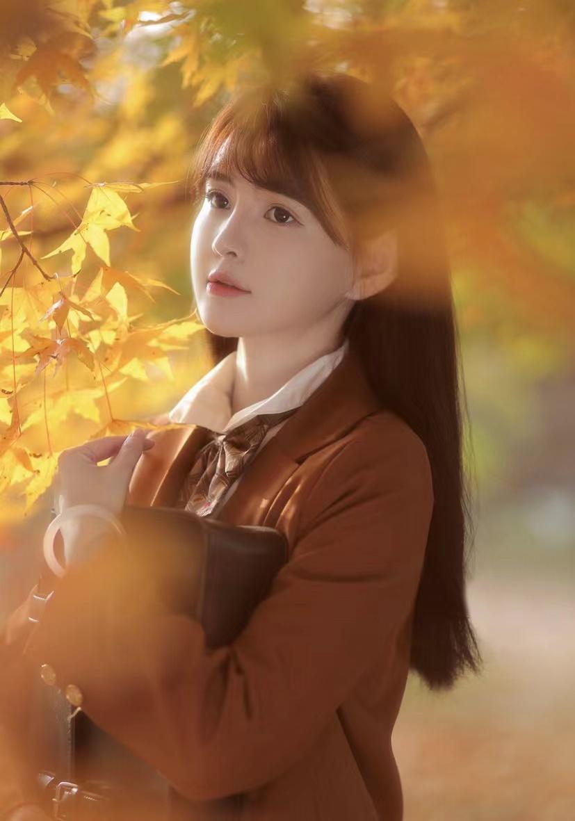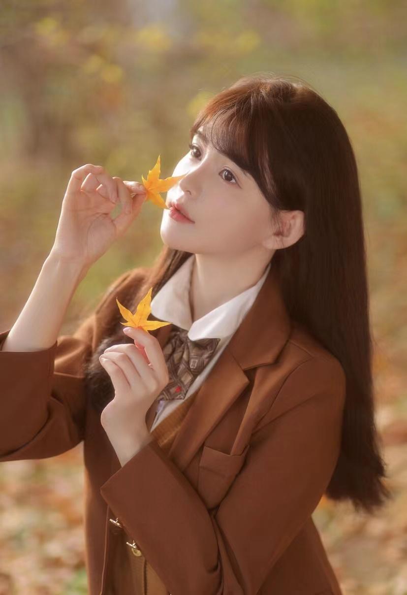 半身照想要拍新意,就要懂得多变换拍摄的角度和机位,比如在树林中拍,便能参考下图的模特,坐在落叶中,手拿树叶,摄影师从前方拍摄,让树叶成为画面简洁的背景,这样拍出的照片,主体清晰,突显面部轮廓的同时也更显脸小。