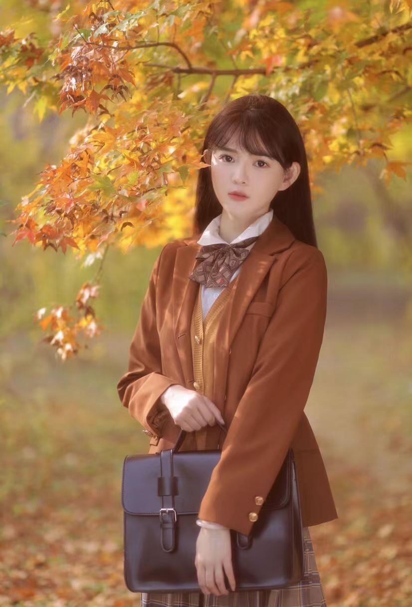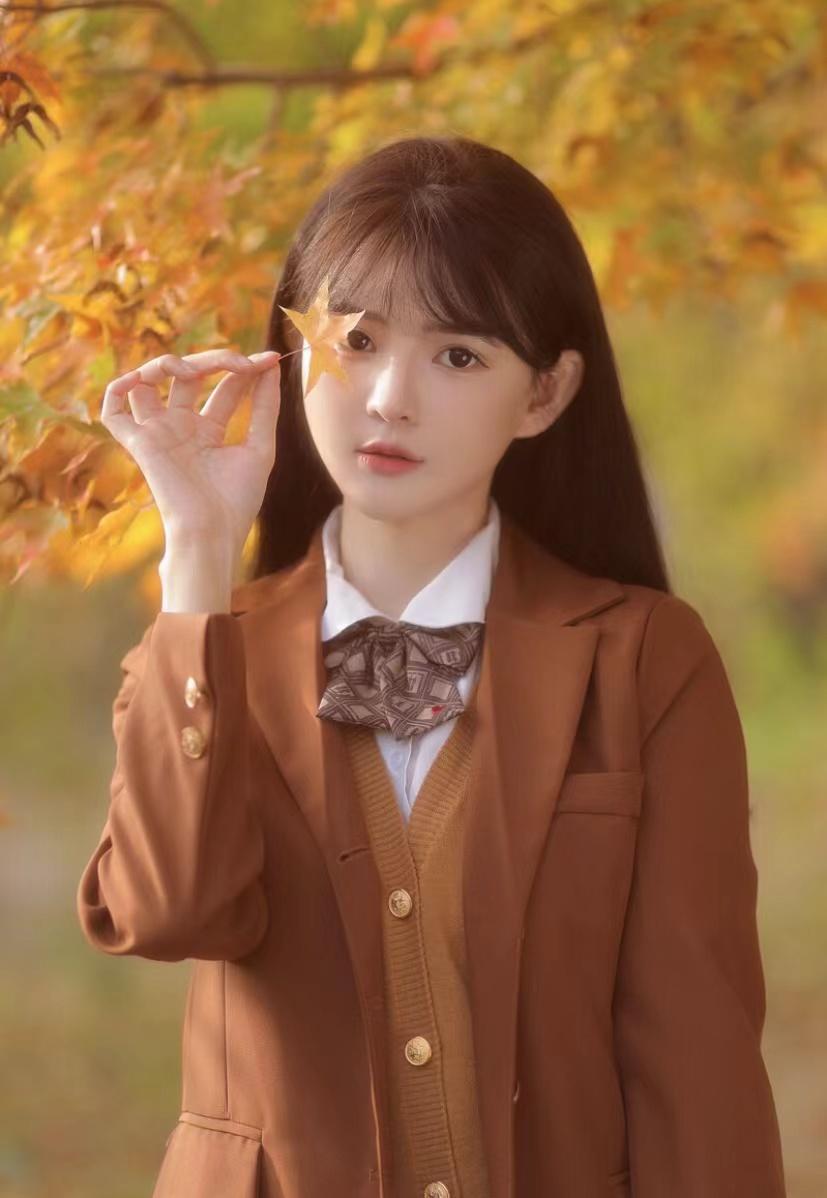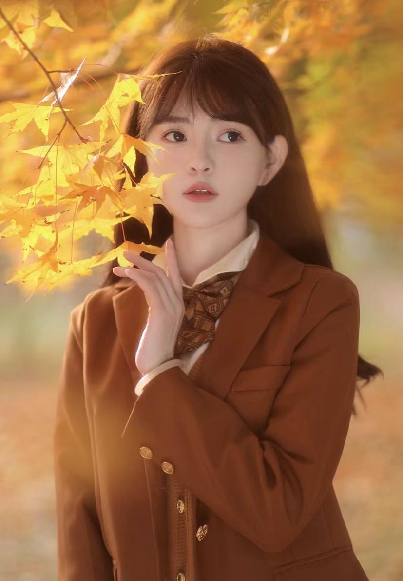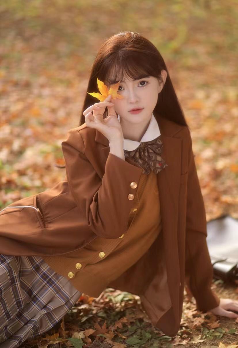 半身照想要拍新意,就要懂得多变换拍摄的角度和机位,比如在树林中拍,便能参考下图的模特,坐在落叶中,手拿树叶,摄影师从前方拍摄,让树叶成为画面简洁的背景,这样拍出的照片,主体清晰,突显面部轮廓的同时也更显脸小。