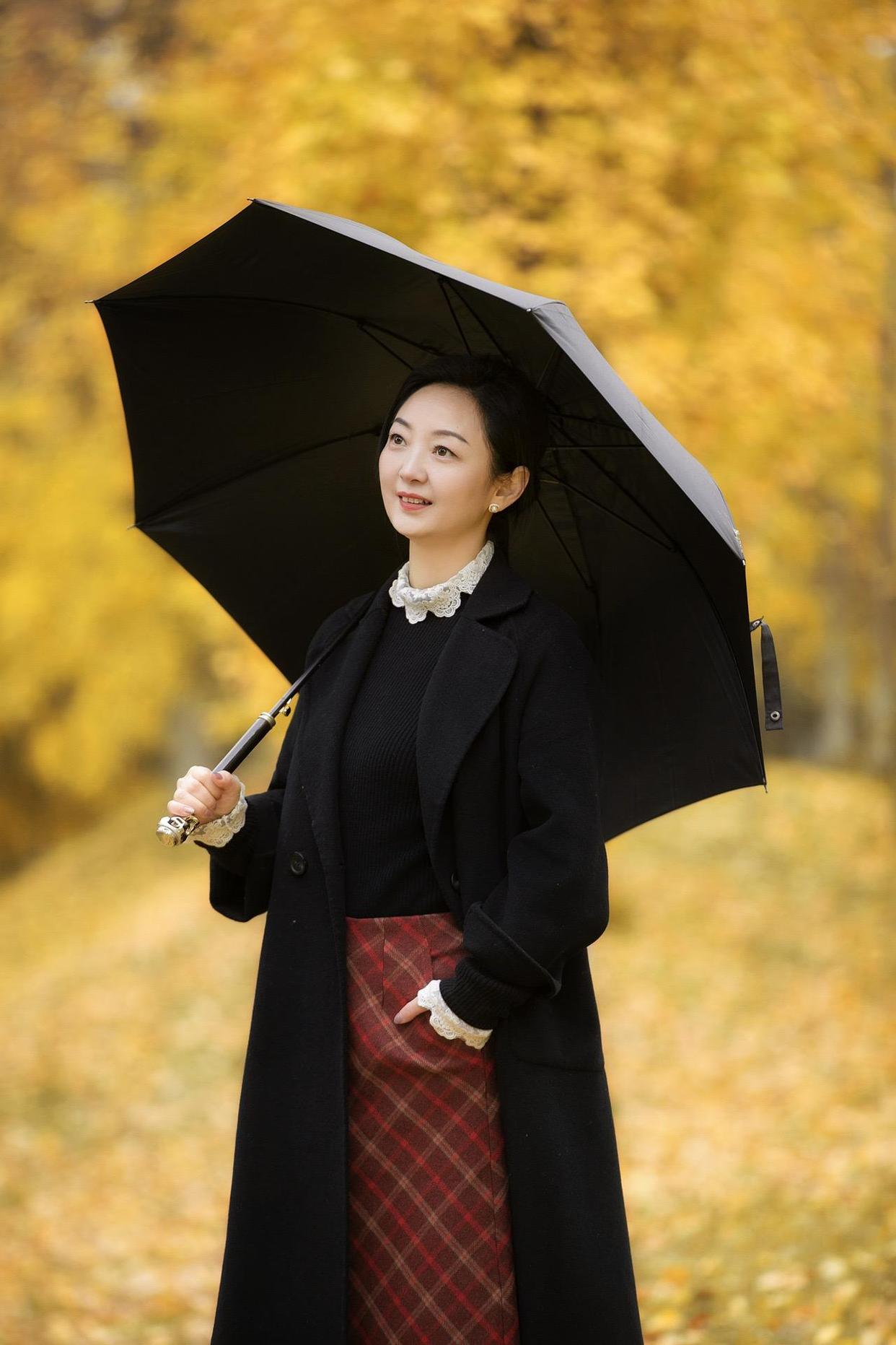 姐姐们拍照,也要懂得借助道具来丰富自己的摆姿,像雨伞、毛巾、围巾、鲜花、书籍等都是很不错的拍照道具,像下面的姐姐,站在银杏林中,一手撑伞,一手插兜,干净利落的姿势拍出强大的气场。